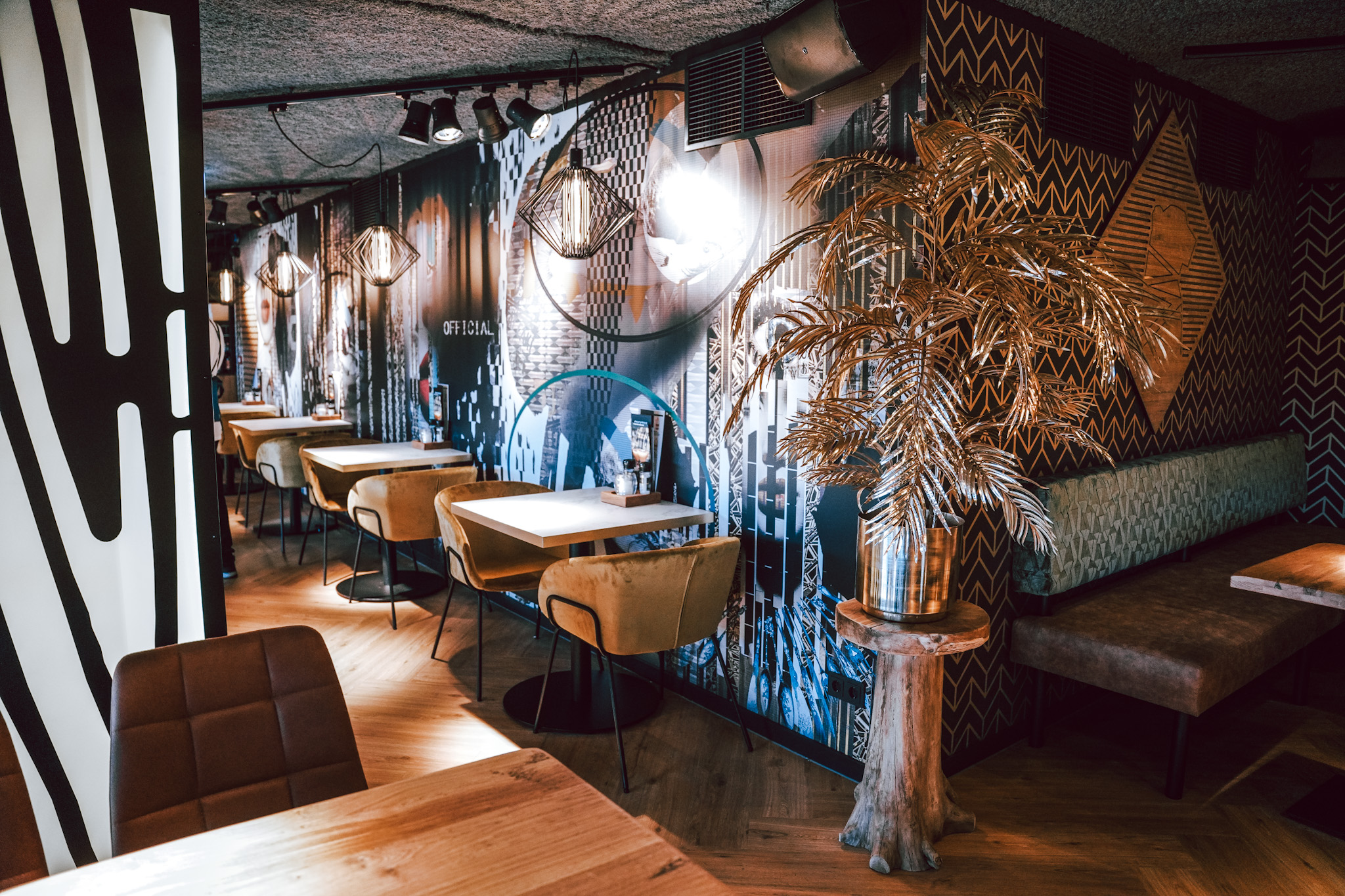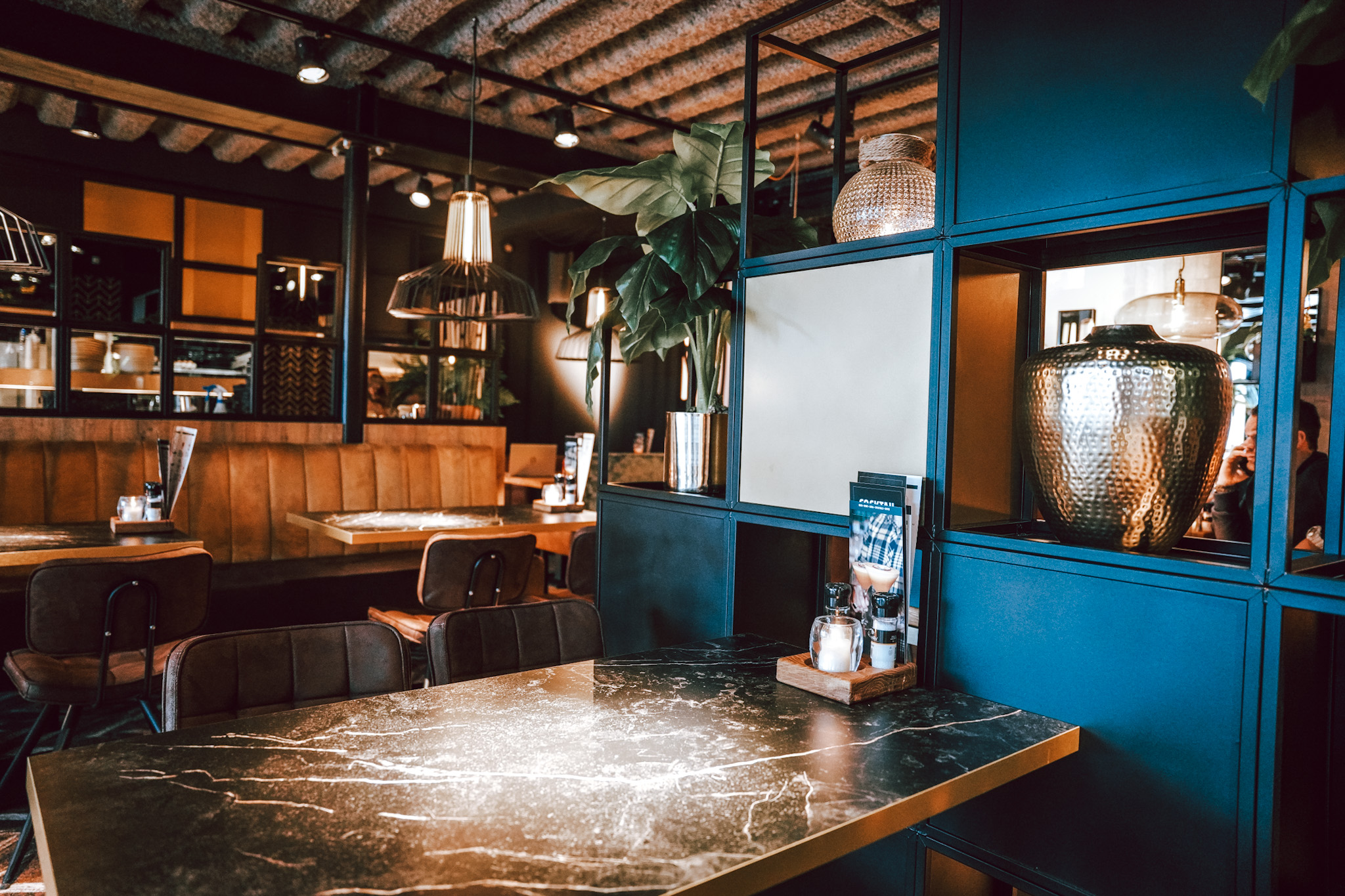 Het restaurant is modern en eigentijds ingericht met luxe ronde zitjes en een grote centrale bar. De zaak heeft een warme uitstraling en is modern gedecoreerd met prints en planten. De keuken is voorzien van een houtskoolgrill voor de bereiding van een uitgebreid assortiment aan vlees-, vis- en vega(n) gerechten.
