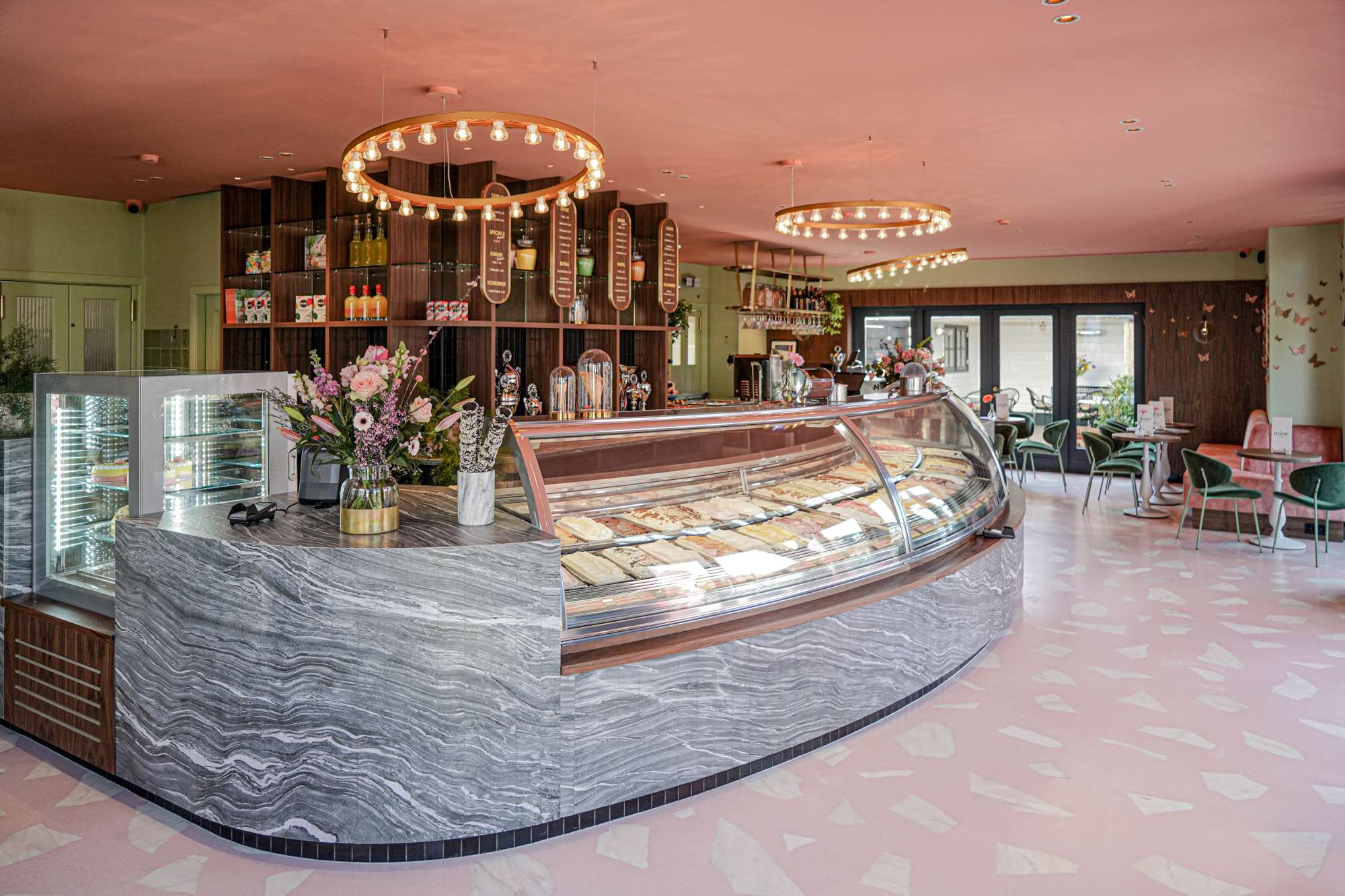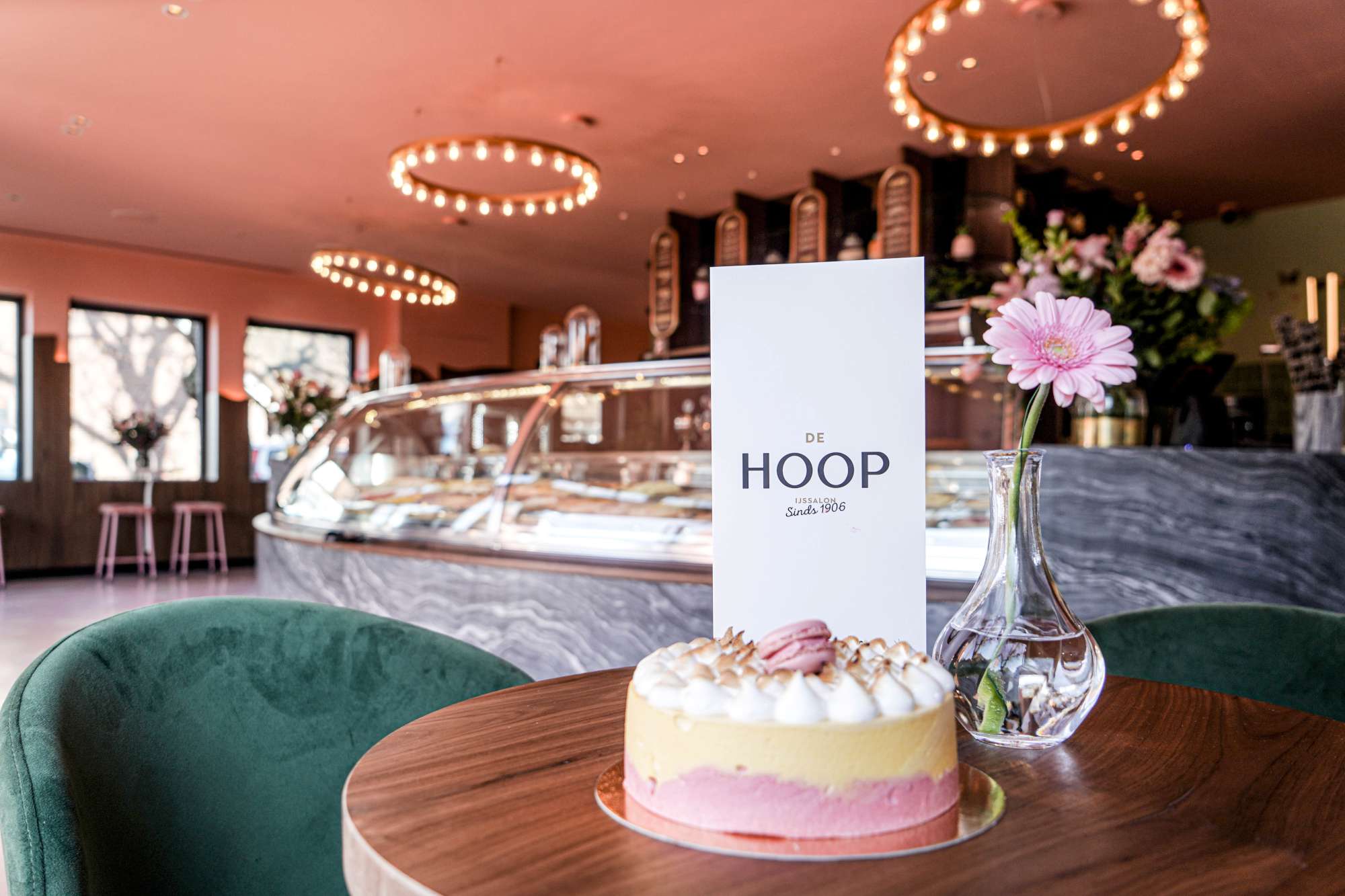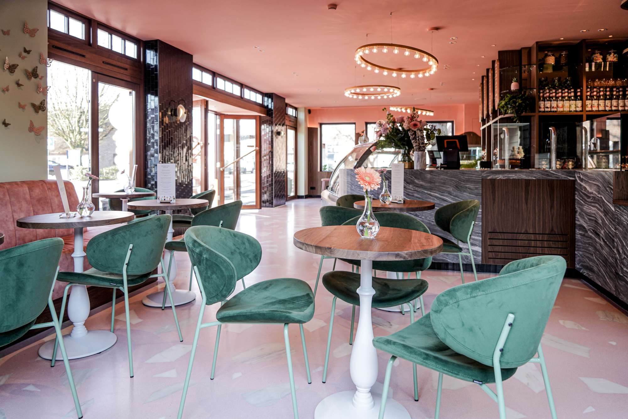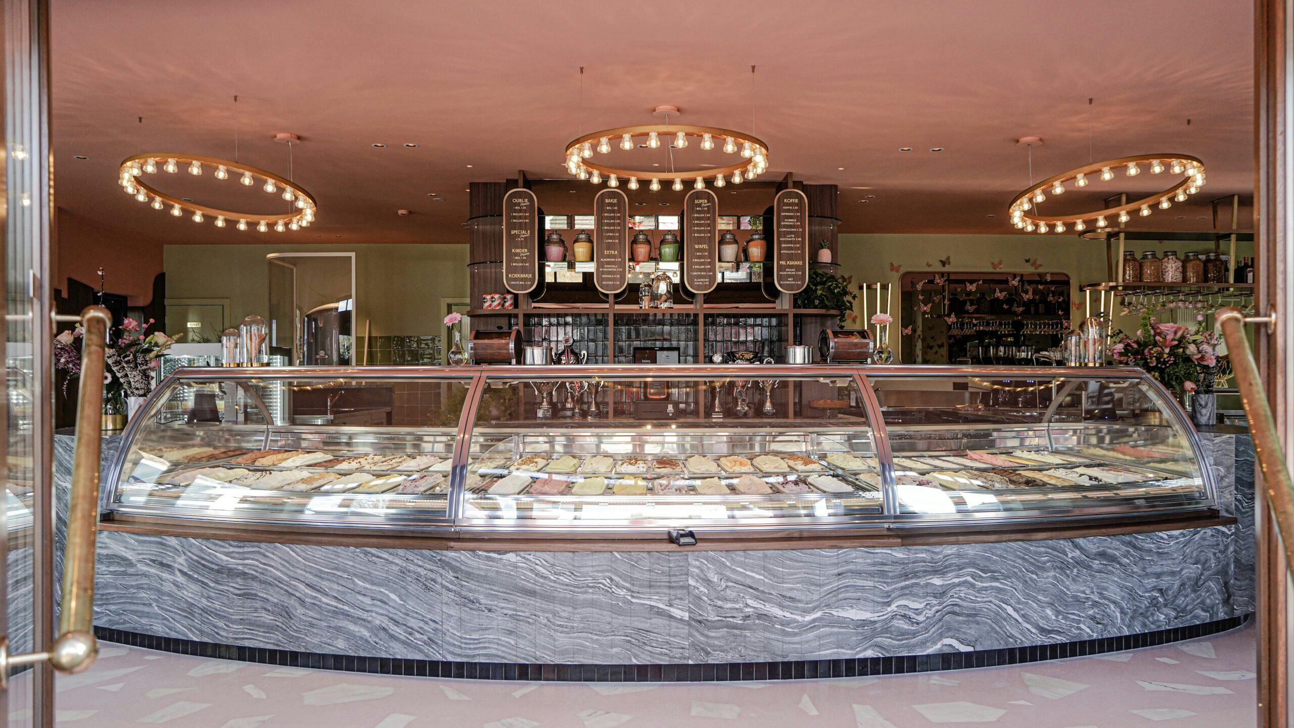 In het interieur is onder andere een chocoladekraam opgenomen. ‘Patisserie en ijs komen steeds dichter bij elkaar’, vertelt Kooij, die zelf Meesterijsbereider is. ‘Zeker bij de nieuwe generatie ijsbereiders. En we hebben een gereviseerde klassieke ijsmachine in de zaak staan. In de zomer kunnen we ijs maken in het zicht van de gast. Zo deed mijn vader het ook al, dus daar ben ik erg trots op.’