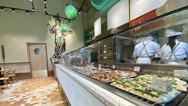 Ander opvallend element zijn volgens Postma de pizza’s in de vitrine. ‘Wij serveren geen ronde pizza’s, maar pizza’s al taglio. Deze plaatpizza’s snijden we in kleinere stukken, zodat mensen zelf hun maaltijd kunnen samenstellen. Als deze in de vitrine liggen, dan springen de kleuren er echt uit. Voor de lunch zijn twee stukken waarschijnlijk voldoende en ’s avonds neem je er dan wellicht één of twee meer.’