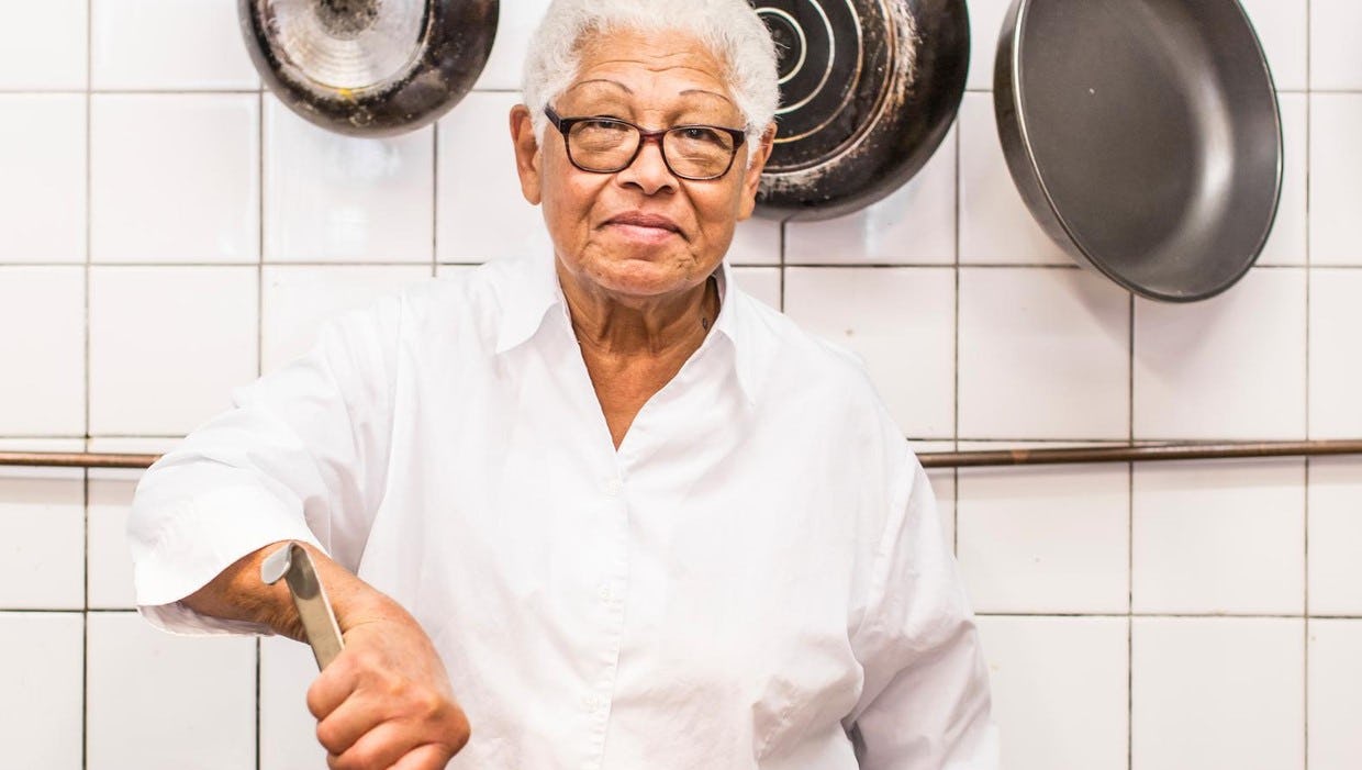 Bij haar binnenkomst is altijd een feest. Haar aanstekelijke lach en de lekkere hapjes die je meteen voor je neus gezet krijgt, maken dat je er nooit meer weg wil. Op haar kruk met wieltjes en met de rollator binnen handbereik bestiert ze nog elke dag de keuken. Hier vandaan gaan buffetten in grote aluminium schalen het hele land door.'
