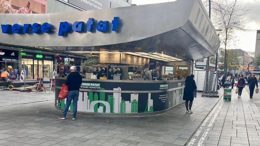 Trots is hij ook op de korte keten als het gaat om de aardappelen voor zijn friet. ‘Dat is een opvallende verandering ten opzichte van de periode hiervoor in deze vestiging. We starten met aardappelen in de schil, die onder de rook van Rotterdam in de Hoeksche Waard worden geteeld, opgeslagen, gewassen en verpakt. Directe levering door de boer, met minder vervoersbewegingen en minder afval.’