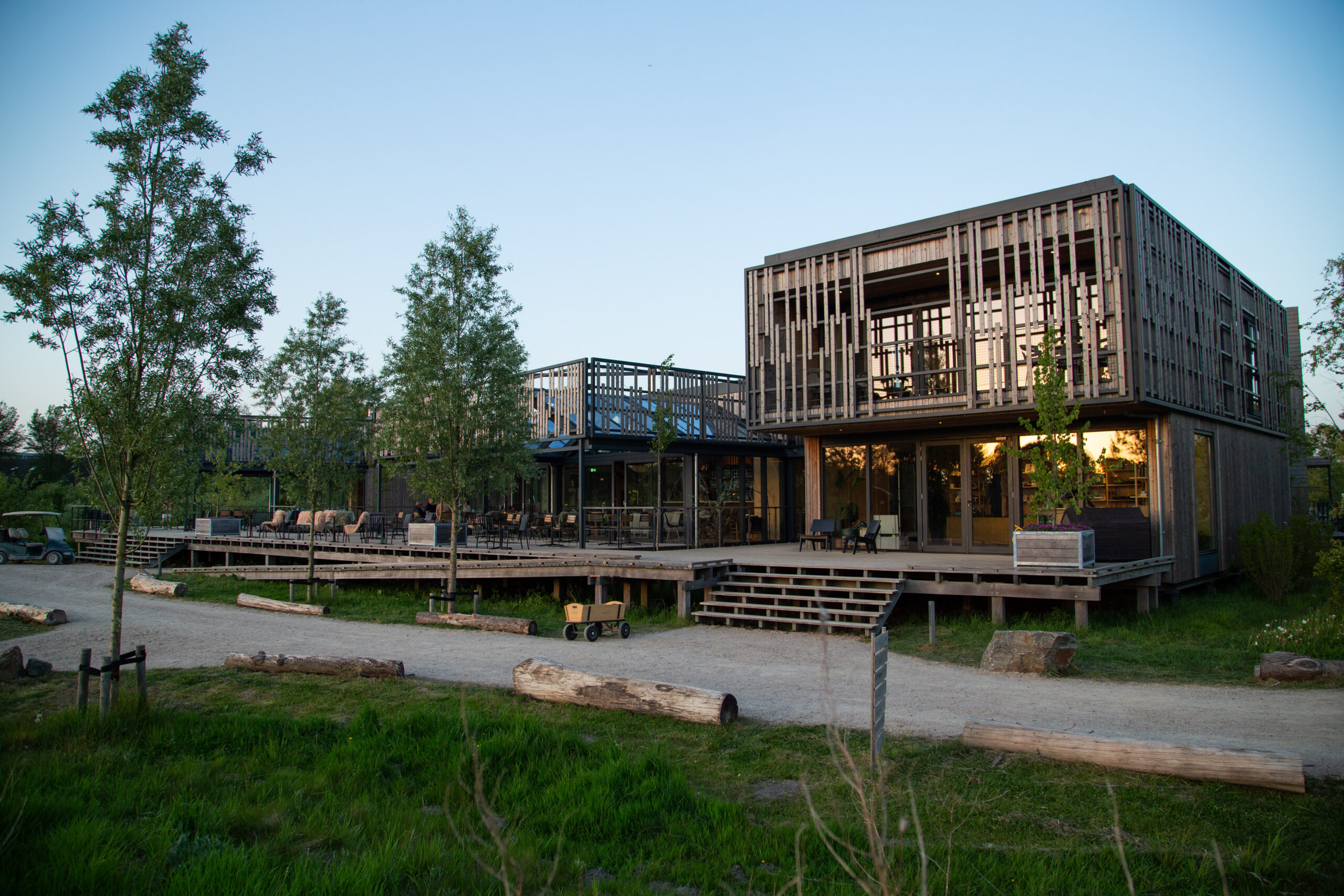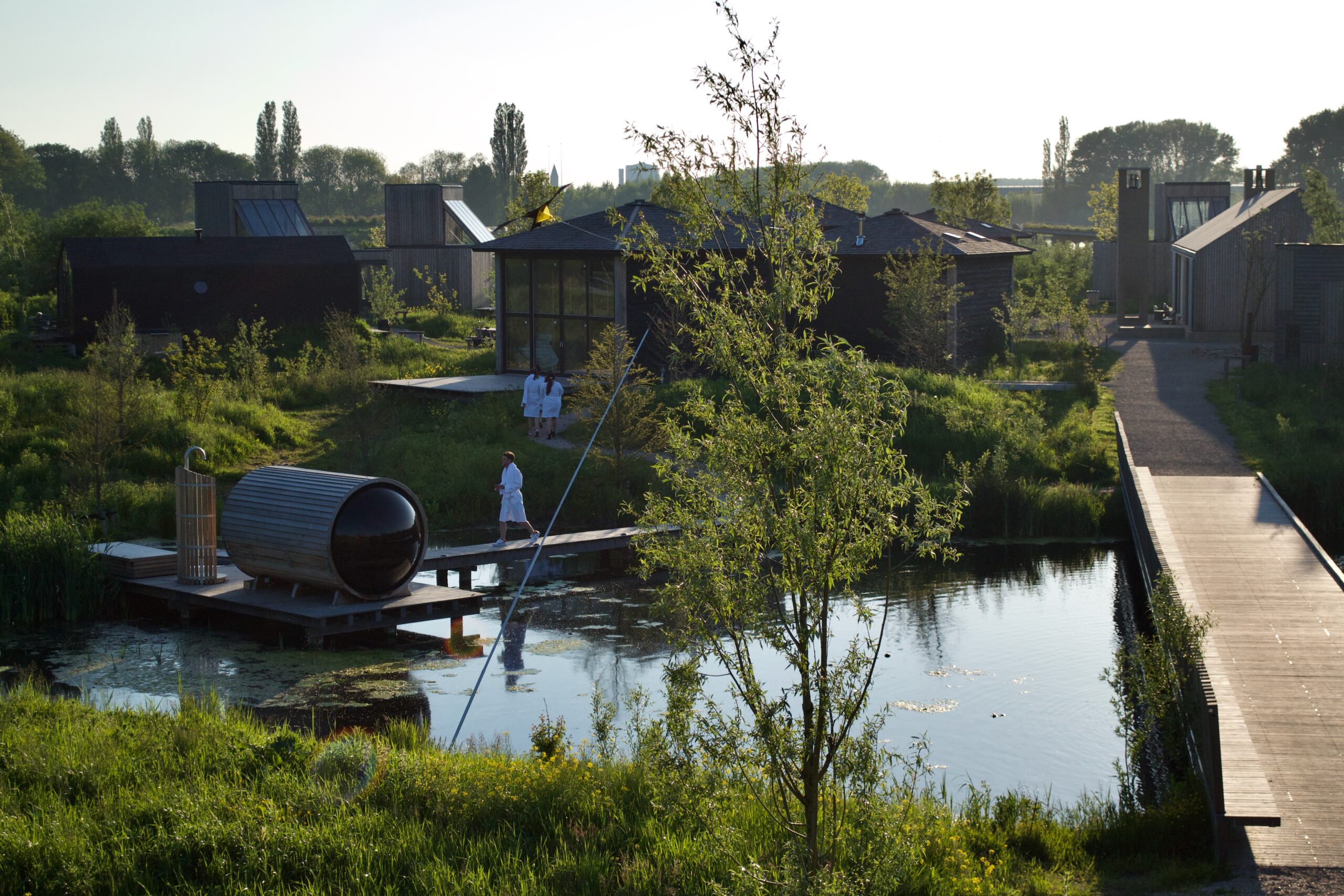 En om de cabins op natuurlijk wijze in het terrein te laten passen, wilde landschapsarchitect Felixx het landschap accidenteren. Dat is de reden dat er nu een grote recreatievijver ligt. ‘Dat was niet een doel op zich, maar we wilden geen grond van buiten het terrein halen.’ Daarnaast zijn zo’n 200 nieuwe bomen en 200 nieuwe struiken aangeplant.