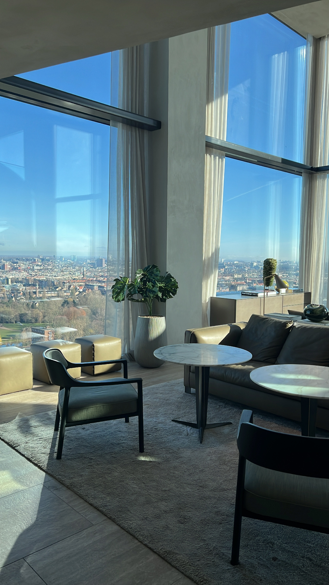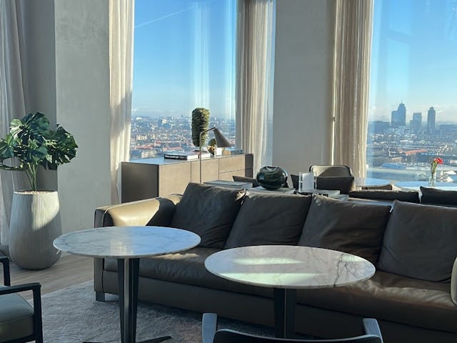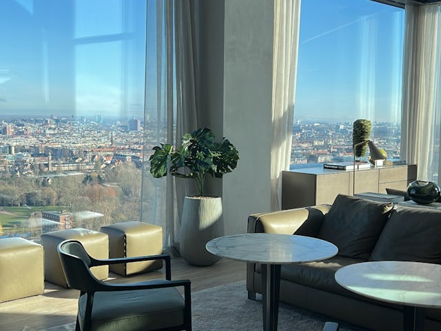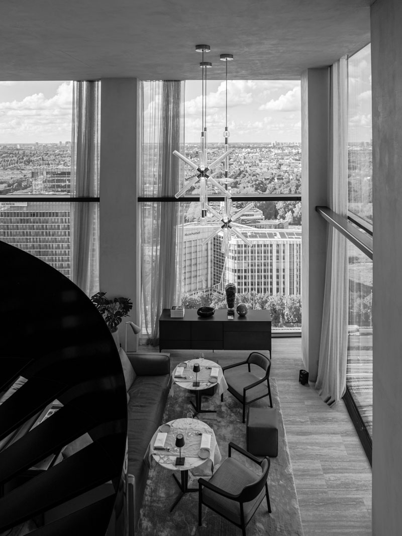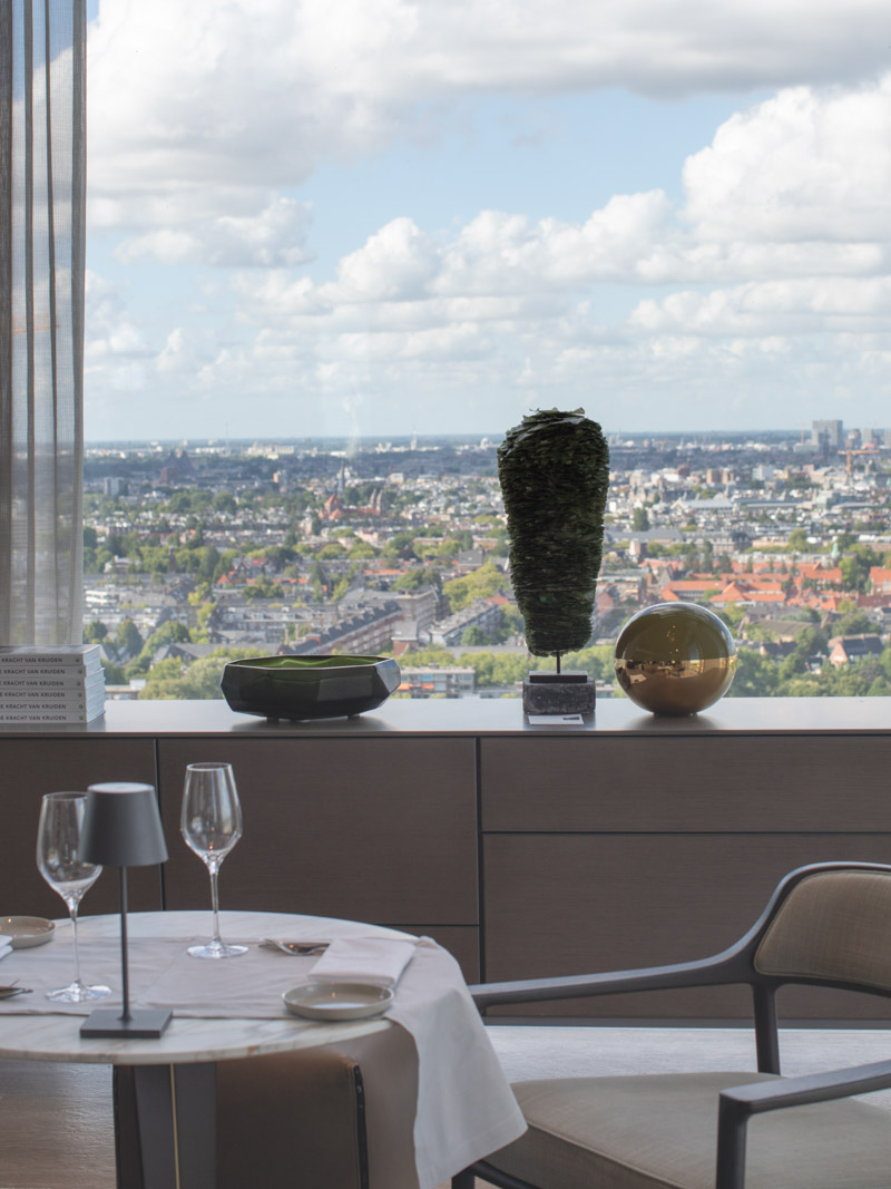 De entree van gastrobar Green ligt verscholen in de interieurwinkel Molteni&C waardoor gasten het gevoel krijgen naar een speakeasy te gaan. Een lift brengt hen naar de bovenste verdieping waar zich een ongekend uitzicht over Amsterdam ontvouwt.