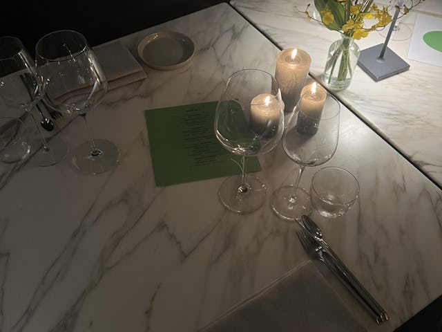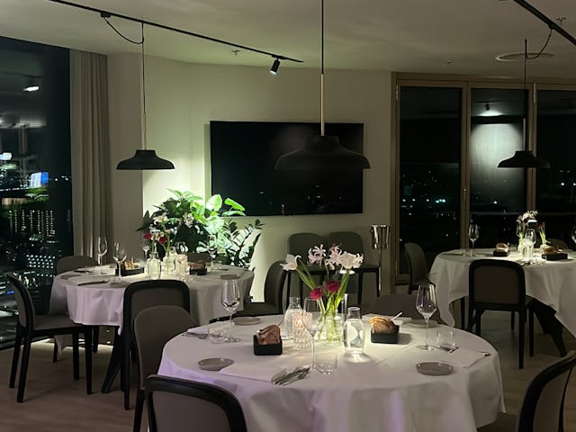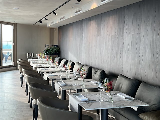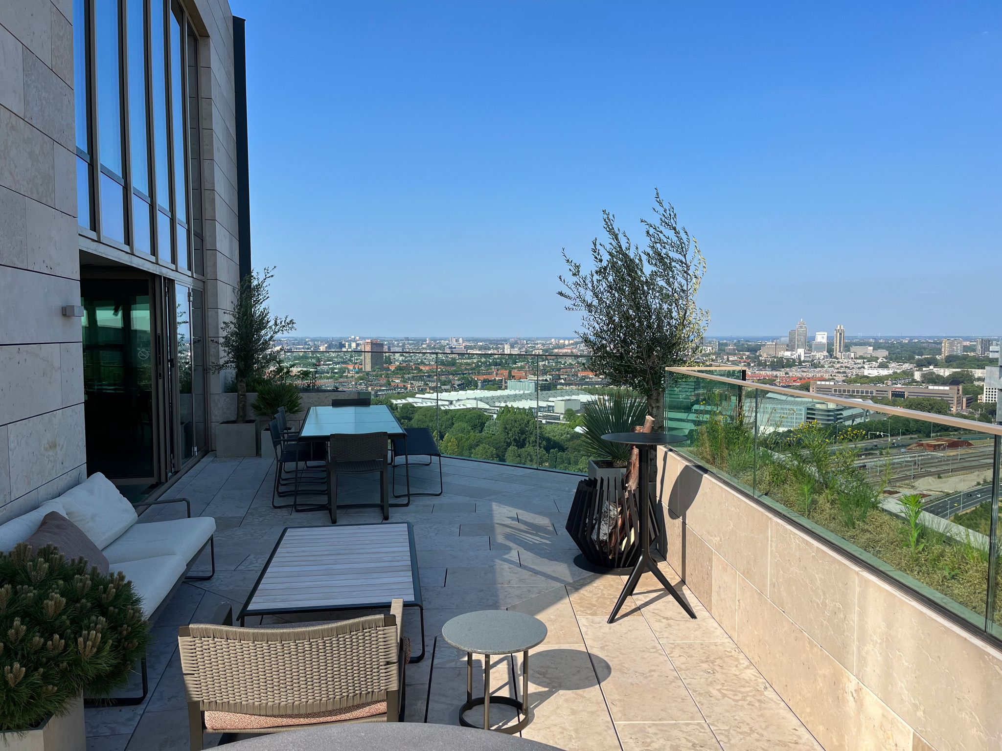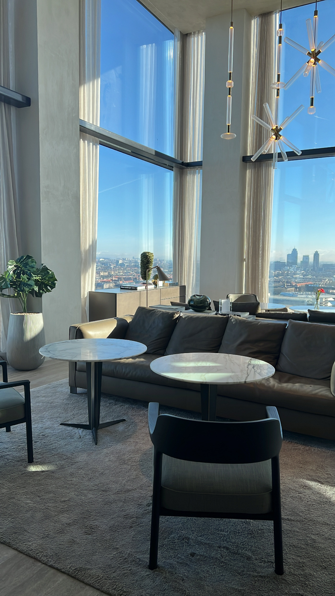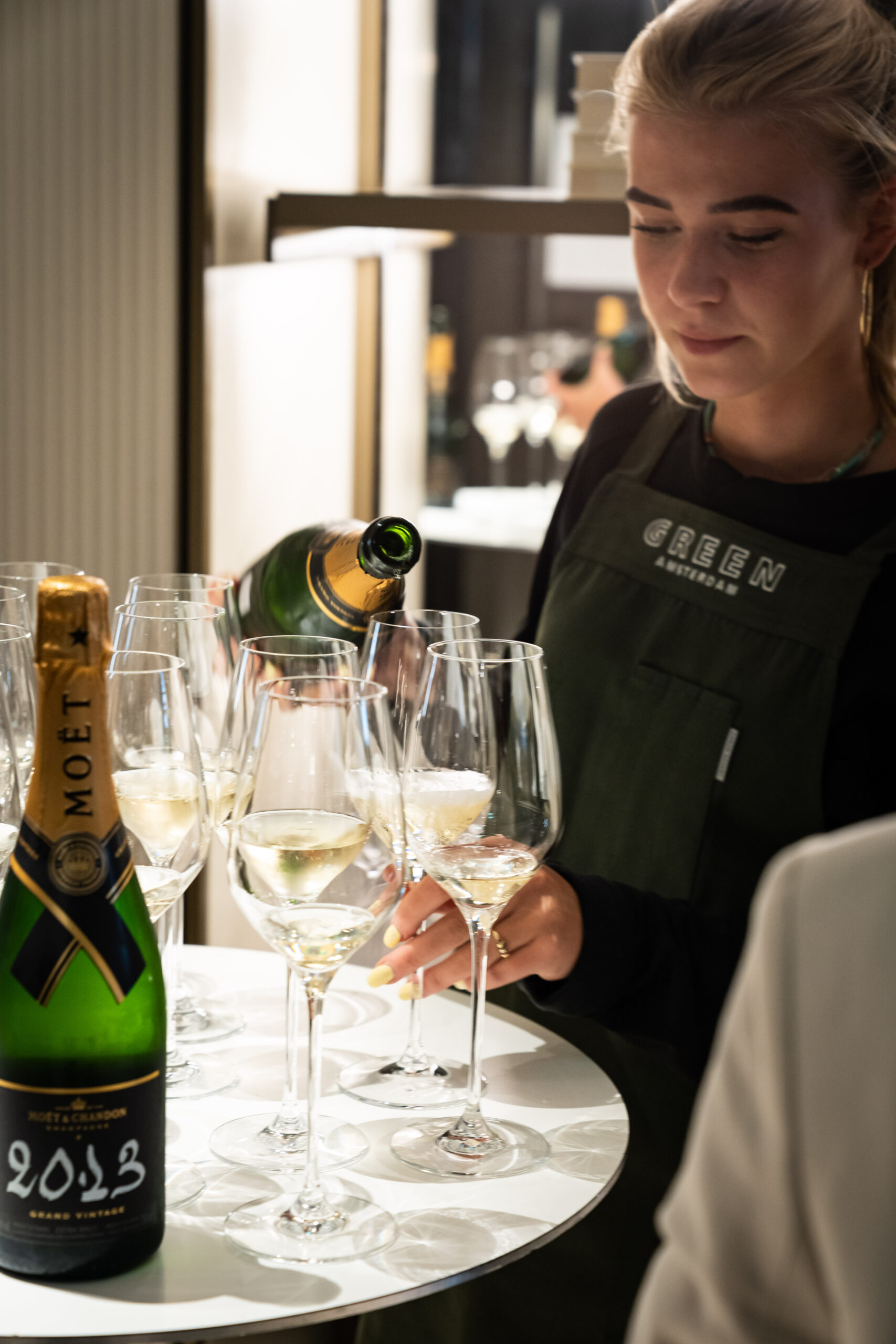 De entree van gastrobar Green ligt verscholen in de interieurwinkel Molteni&C waardoor gasten het gevoel krijgen naar een speakeasy te gaan. Een lift brengt hen naar de bovenste verdieping waar zich een ongekend uitzicht over Amsterdam ontvouwt.
