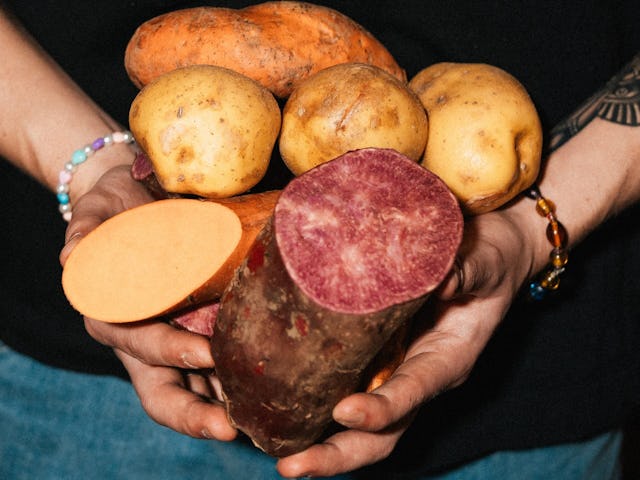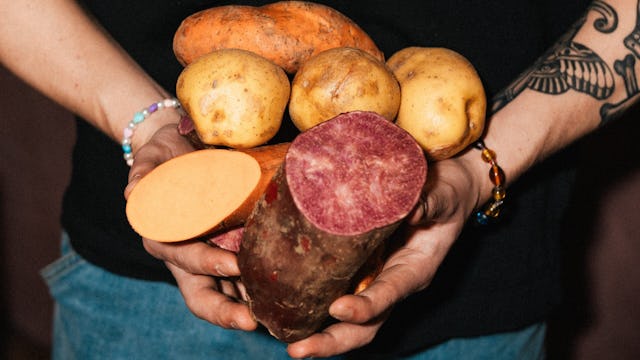 Laura Estévez, restaurant manager van Conscious Hotels, vertelt over het ontstaan van Riot: ‘Onze chef maakte een gerechtje met krokante aardappeltjes, labneh, zhug, knoflook en beurre noisette. Dit was zo ontzettend lekker dat ik begon te grappen over een restaurant waarbij deze krokante aardappel centraal zou staan. Tijdens dat gesprek herinnerde ik me ook dat mijn vriendin en kunstenares Roosje Verschoor een kunstwerk had gemaakt over het Aardappeloproer, een onbekend, maar inspirerend stukje Amsterdamse geschiedenis. Hieruit kwam uiteindelijk Riot voort.’