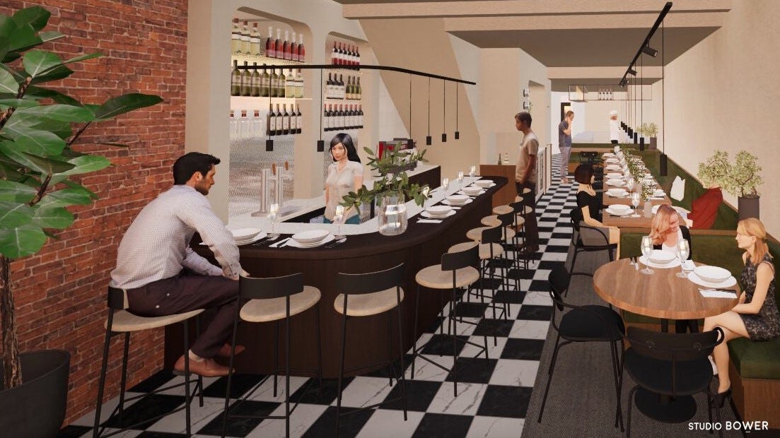 Gastvrijheid en het gebruik van pure, natuurlijke producten vormen de basis van het nieuwe restaurant van de sommelier. Op basis van deze kernwaarden heeft Studio Bower een passend interieurontwerp gerealiseerd. Vooraan in het restaurant prijkt een bar van warm donker hout met ronde vormen, waar gasten plaats kunnen nemen en van hun maaltijd kunnen genieten. ‘De interactie tussen het personeel en de gasten is van essentieel belang, daarom hebben we gekozen voor een uniforme barhoogte’, legt de ontwerper van Studio Bower uit.