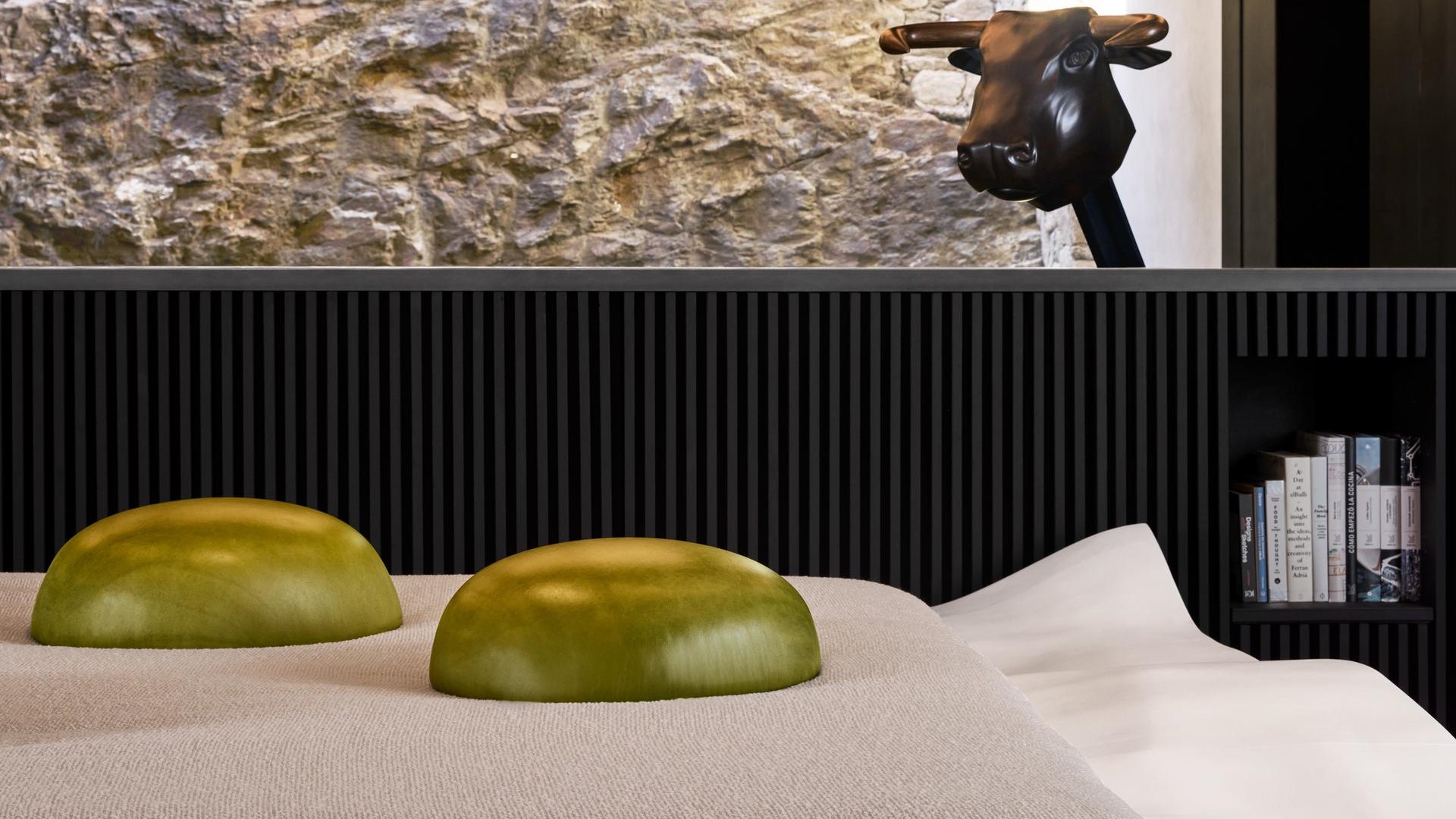 - Een nacht in het voormalige restaurant op een ‘plated’ bed, geïnspireerd op de beroemde bolvormige olijf van elBulli.