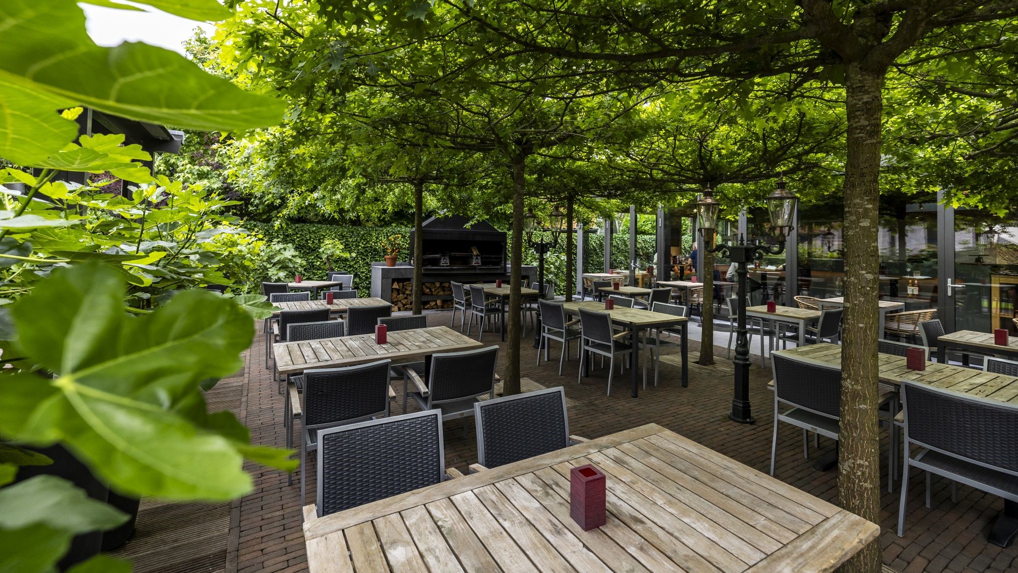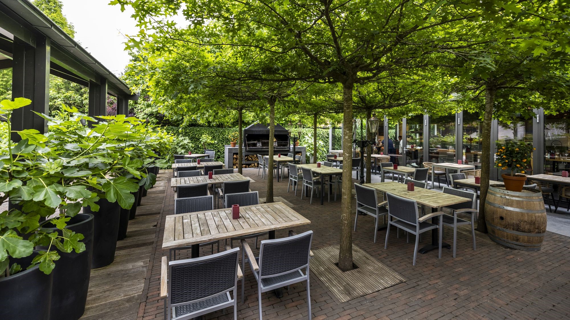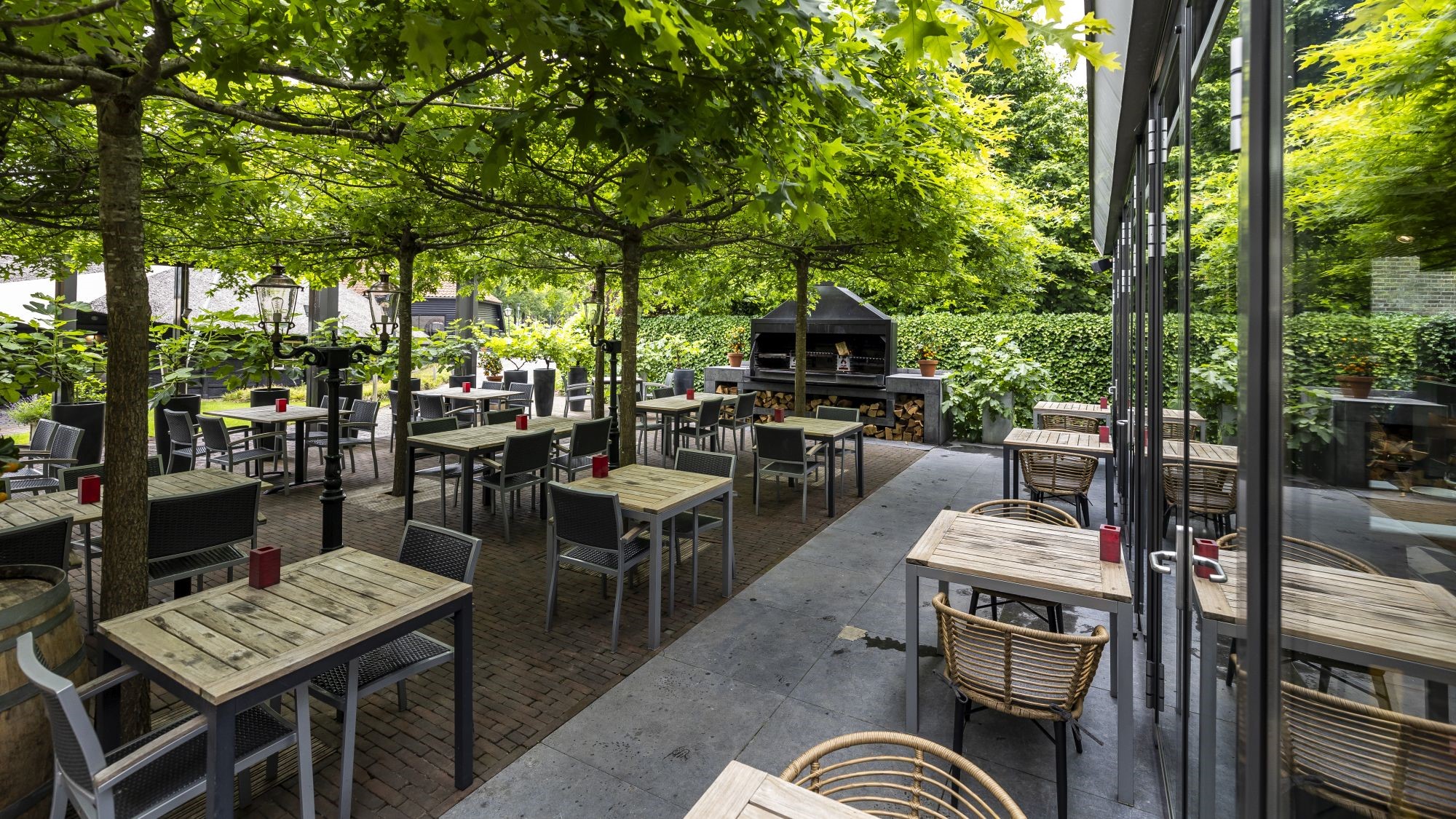Bij aankomst valt direct de grandeur van het terras op. Medewerksters verwelkomen gasten met een glimlach. De kennis van producten en wijnen is indrukwekkend. De open grill op het terras, waar houtblokken worden toegevoegd voor de sfeer, versterkt de ambiance.