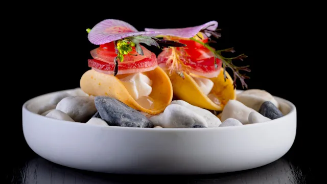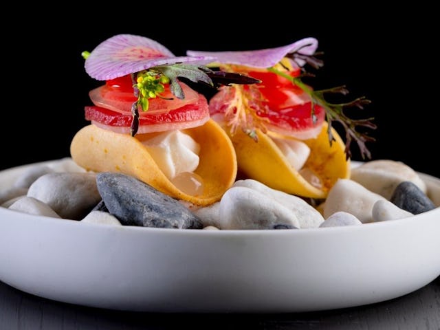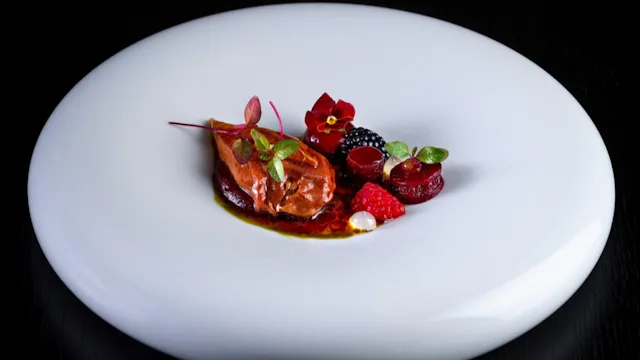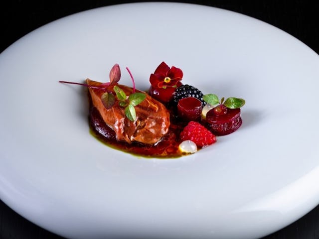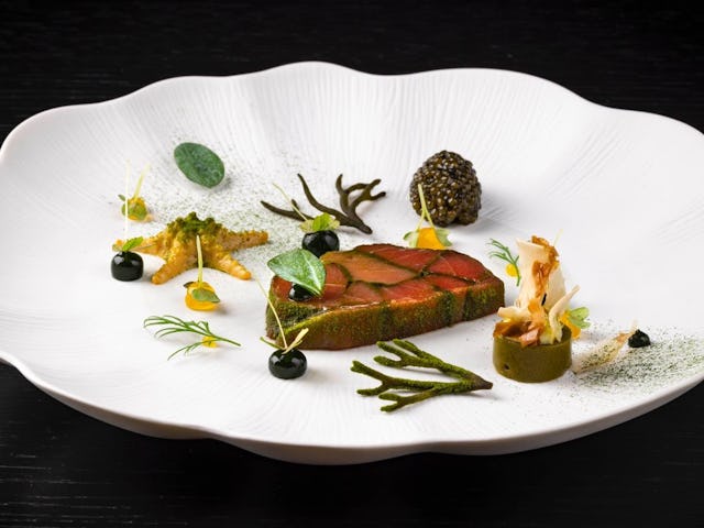 In het pop-up-restaurant laat Dalhuisen proeven hoe zijn culinaire signatuur zich de afgelopen jaar ontwikkeld heeft. Dalhuisen kookt zuiver en uitgesproken. Een flinterdun gesneden coquille gemarineerd met fleur de yuzu serveert hij met plakjes eendenlever, crispy rettich en appel in siroop van gember-shichimi-tōgarashi.