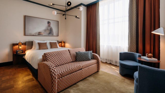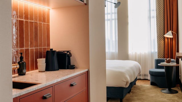 Het hotel ademt geschiedenis en combineert de originele architectuur van de Nieuwe Haagse School met moderne luxe, ontworpen door het gerenommeerde ontwerpteam van Nicemakers. De Deli biedt versgebakken brood en delicatessen voor een snelle stop, terwijl Suus, met een groot terras en privé-mezzanine, perfect is voor zakelijke en informele bijeenkomsten.