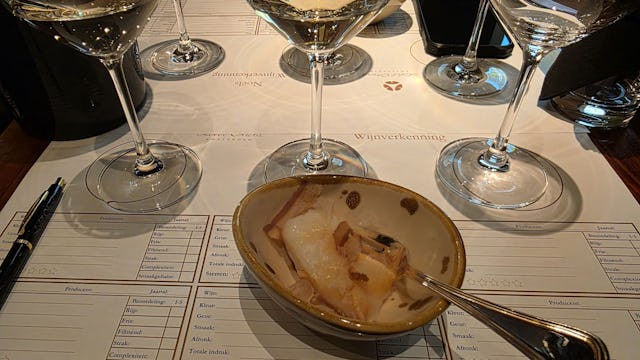 In deze eerste sessie werden pure smaken als ansjovis, gekonfijte kabeljauw tot dungesneden Wagyu geserveerd in een uienbouillon. Smaakvolle combinaties met als doel om het effect van wijn op spijs te laten ervaren en te verklaren aan de hand van verhalen van Vanwittenbergh over terroir, klimaat en de manier van wijnmaken.