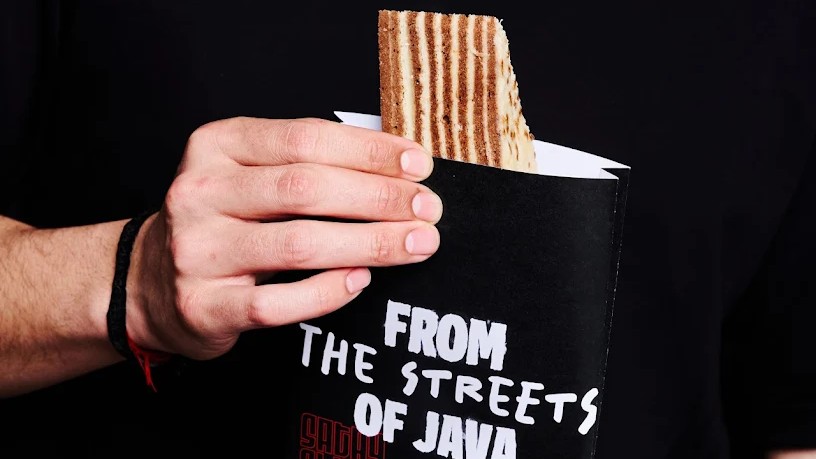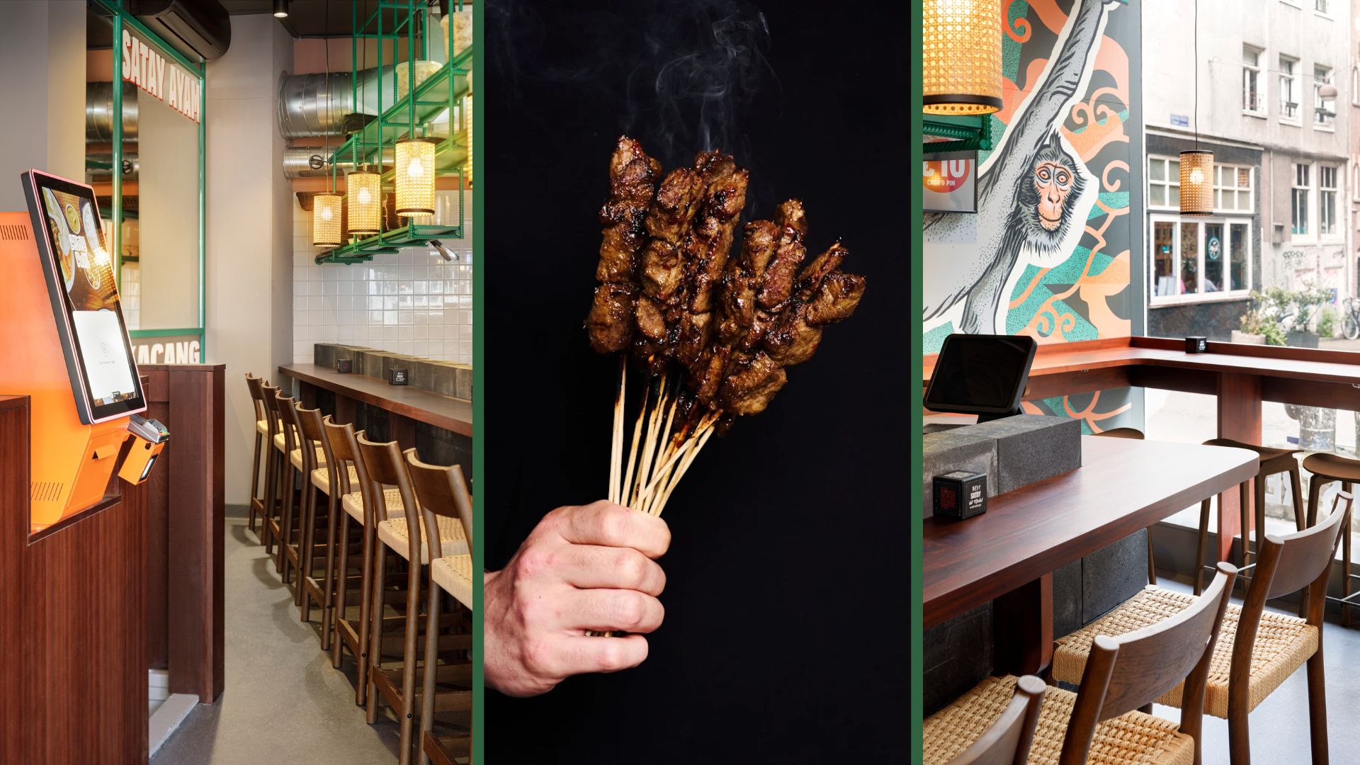 Centraal in het restaurant staat een op maat gemaakte houtskoolgrill. Dankzij een spaakconstructie draait het vlees tijdens het grillen boven het vuur. Gasten kunnen plaatsnemen aan de bar of bij het raam en zien hoe hun bestelling live wordt bereid. De inrichting, ontworpen door designstudio Ninetynine, is geïnspireerd op een traditioneel Indonesisch eetstalletje.