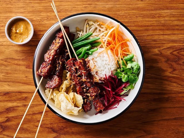 Het menu bestaat uit verschillende soorten saté, zoals kip met pindasaus en lam in ketjapsaus. Bijgerechten als lontong (rijstcake), atjar en sambal vullen het bord. Alles wordt huisgemaakt – van de marinades en boemboes tot de pindasaus, waarvoor de pinda’s vers worden gemalen op locatie.