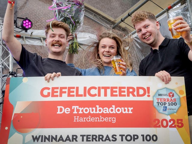 De Troubadour uit Hardenberg mocht de prijs voor de nummer 1 van de Terras Top 100 in ontvangst nemen. Op de tweede plek eindigde De Oude Herbergh in Oosterbeek en de derde plek was voor Het Noorden van Aalten uit Aalten.
