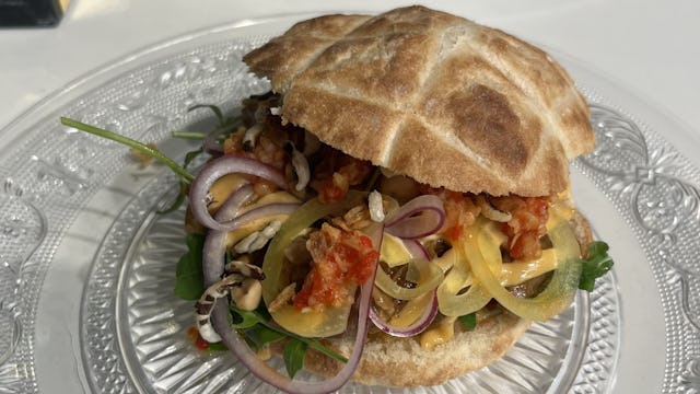 Als brood kozen Frank en Maud voor de lepinja, een authentieke flatbread uit de Balkan. 'Dit lekkere, krokante broodje kan je goed vullen en het wordt niet zompig', zegt Frank Willems. 'We hebben het gevuld met gemarineerde kip, ssamyang saus, zoetzure sambal, gepekelde ui en een crunch van pinda en wilde rijst.'