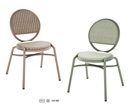Ami is een vrolijke, aluminium terrasstoel. Het vlechtwerk is beschikbaar in drie kleuren, Eucalyptus Cayenne Ivory, Cardamom Blush Pink Ivory en Café Latte Urban Mint Ivory. Het is de moderne interpretatie van de Café de Paris stijl. De stoel is ontworpen door Nathalie Schellekens van Studio ONS.