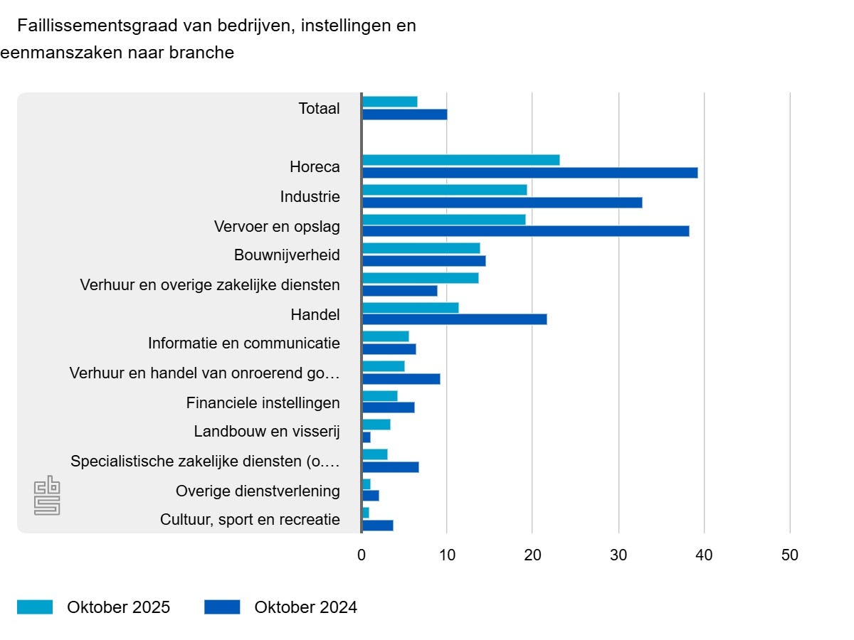 Net als in september werden in oktober relatief gezien de meeste faillissementen uitgesproken in de horeca. Per 100.000 horecabedrijven gingen er ruim 23 failliet, vergeleken met meer dan 39 een jaar eerder. Dat is ongeveer 41 procent minder dan het jaar ervoor.