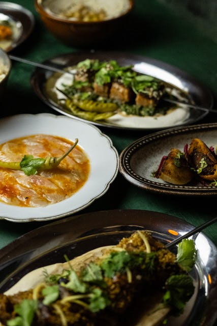 aangevuld met kleine kleurrijke gerechtjes en snacks. Daarna kiezen gasten een hoofdgerecht