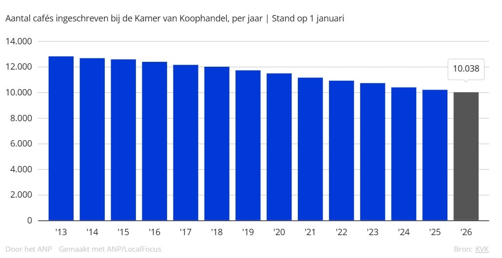 Op 1 januari 2026 stonden er 10.038 cafés in het Handelsregister van de KVK, een jaar eerder waren dat er 10.240. Er zijn dit jaar dus 200 cafés minder.