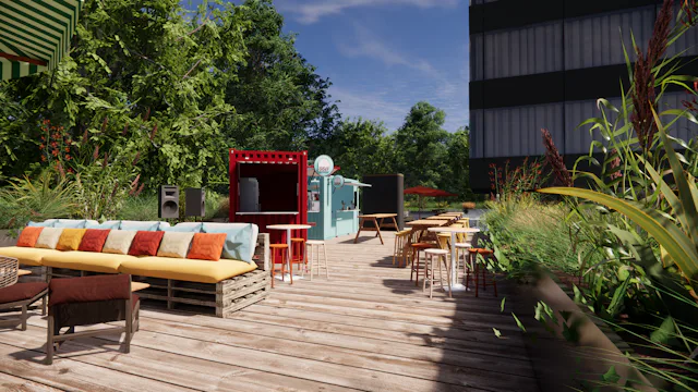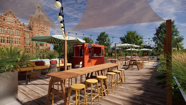 Het terras is ingericht met strandstoelen, zitzakken, picknicktafels, borrelbar en zand onder de voeten. Door de ligging zijn er de hele dag zonnige plekken, aangevuld met schaduwplekken voor verkoeling. Volgens de initiatiefnemers speelt het concept in op de behoefte aan toegankelijke buitenplekken in de stad.