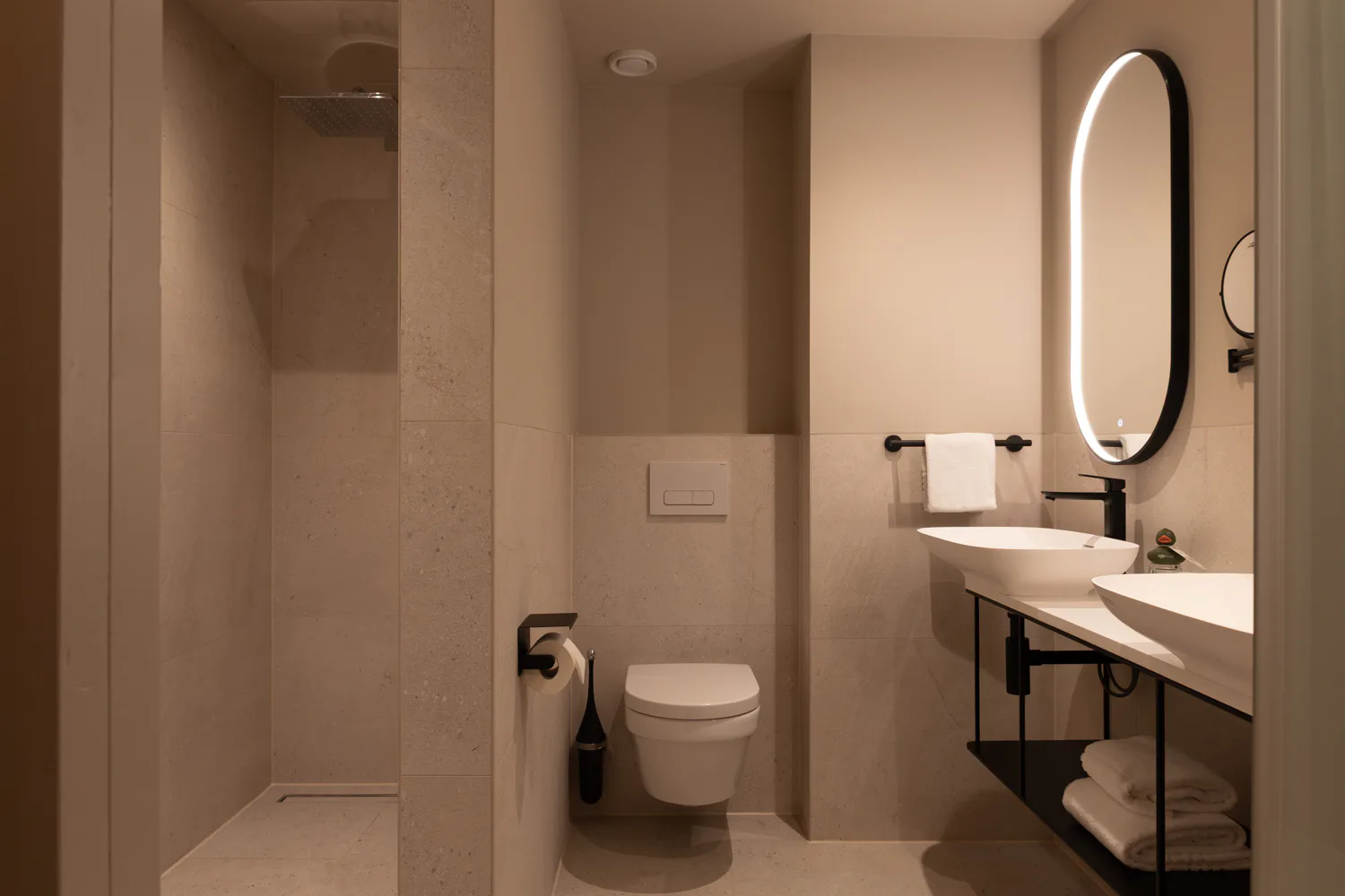 De nieuwe kamers zijn ingericht in een moderne hotel chic-stijl, met warme, neutrale tinten en subtiele metallic accenten. Functionaliteit en beleving gaan hand in hand, met maatwerkoplossingen en geïntegreerde verlichting die zowel praktisch als sfeervol is.