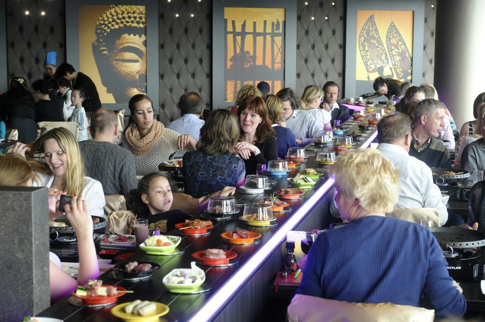 Gasten van zijn meest recente aanwinst, View, bereiden hun gerechtjes zelf aan tafel. De bordjes – bijvoorbeeld gele bordjes voor kip, blauwe voor vis, rode voor rundvlees en groene voor vegetarische gerechtjes - komen langs de tafeltjes op een lopende band. Op tafel staat een gril waarop de gasten zelf de gerechten bereiden. Voor de prijs van 34,50 euro eten en drinken (fris, koffie/ thee en bier (Heineken) en wijn) gasten twee uur onbeperkt. Een half uur langer blijven kost 5 euro per persoon.
