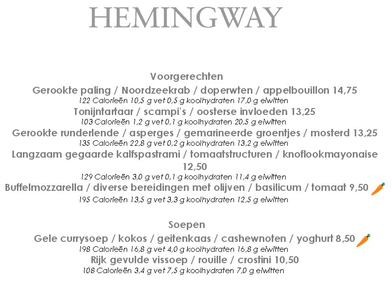 Ruim een half jaar werkt Hemingway nu met deze speciale menukaart. Op de kaart staat per gerecht vermeld het aantal calorieën, de hoeveelheid vet, het aantal koolhydraten en hoeveel gram eiwitten het gerecht bevat. Koks van het hotelrestaurant rekenen per ingrediënt de hoeveelheden uit en komen zo tot de totale hoeveelheden per gerecht.