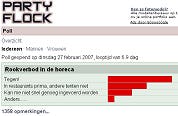 Uit de poll blijkt dat 48 procent van de Partyflock.nl-bezoekers tegen een rookverbod is. 29 procent vindt een rookverbod in restaurants prima, maar wil het niet in ‘andere tenten’. 18 procent zegt dat een verbod niet snel genoeg kan worden ingevoerd.