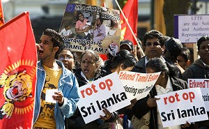 De Tamils demonteren tegen de onderdrukking van hun volk in Sri Lanka. Dat doen vanaf begin april dagelijks. ‘De ene dag zijn ze met twintig, dan weer met veel meer. En ze schreeuwen de hele dag hetzelfde onverstaanbare zinnetje. Het is om horendol van te worden’, aldus Van den Broek.