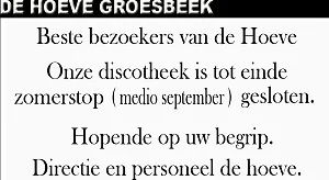 De sluiting van de discotheek is op initiatief van eigenaar Piet Langeveld, zo meldt De Gelderlander. Op de website van de dancing staat te lezen dat De Hoeve tot medio september dicht is. De directie en het personeel vragen begrip voor de sluiting.