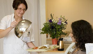 Het ziekenhuis wil dat er een restaurantbeleving ontstaat bij patiënten. Personeel dient de maaltijd op door cloches op te tillen voor het oog van de patiënt.