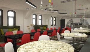 De ruimte moet flexibel in te delen zijn en door grote en kleine groepen gebruikt kunnen worden: formeel en informeel. Door het creëren van verschillende zitgroepen - krukken, banken, vergadertafels en fauteuils - ontstaat er een dynamisch geheel.