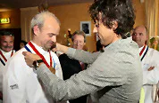 Gisteren kreeg Wilbert Palm van ijssalon Bastani de versierselen die horen bij de titel van Meesterijsbereider omgehangen door ex-schaatser Bart Veldkamp. De oud-schaatser vertelde in zijn toespraak een groot ijsliefhebber te zijn. ,,Eerst krujg je medailles en nu hang ik ze om’’, verwoorde hij zijn bijdrage in het Brabants Nieuwsblad.