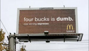 McDonald’s en Dunckin’Donuts leggen Starbucks het vuur aan de schenen. Beiden proberen met grote campagnes de het marktaandeel van de koffiegrootmacht onderuit te halen. Ze hekelen de hoge prijzen die je bij Starbucks voor een kop koffie moet betalen.