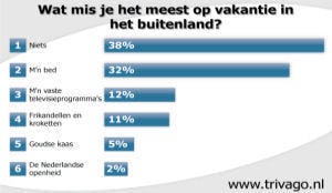De online enquête “Wat mis je het meest op vakantie in het buitenland?” is beantwoord door 5352 gebruikers op Trivago uit Nederland, Spanje, Frankrijk, Verenigd Koninkrijk, Duitsland en Italië in de maanden april en mei 2009.