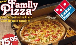 De familie pizza – geschikt voor twee volwassenen en twee jonge kinderen - kost tijdelijk € 15,95 en wordt geleverd met drie bijgerechtjes twee sausjes, zo meldt de website van Domino’s. Afhalen of laten bezorgen is even duur.