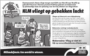 Milieudefensie plaatste maandag 18 juni een advertentie in dagblad Trouw om duidelijk te maken dat vliegen op biokerosine, wat wordt gemaakt uit ...