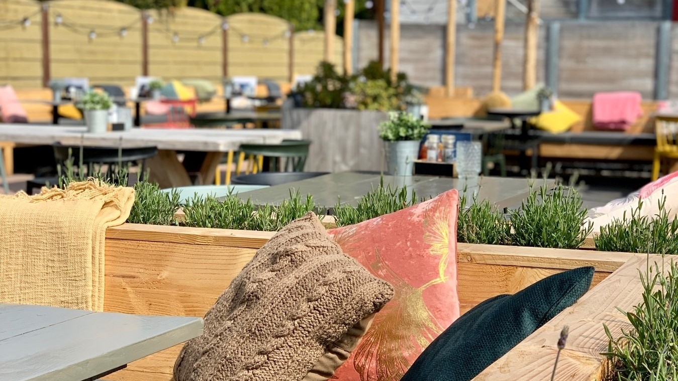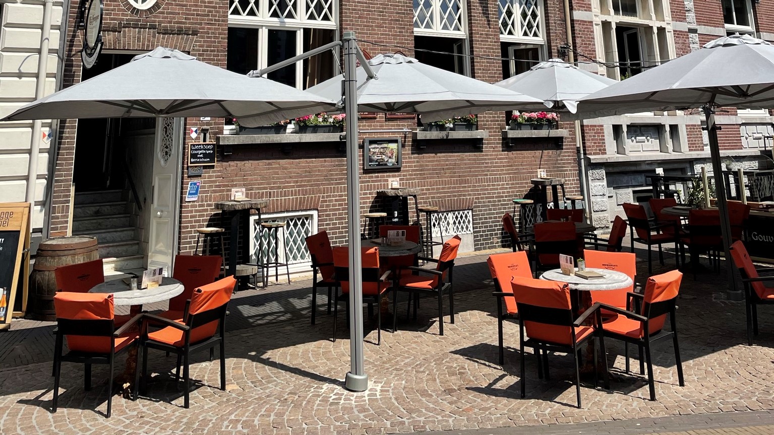Het terras oogt pas nieuw en fris. Prachtige hardstenen tafels, stevige zwartmetalen stoelen met houten armleuning en strakke oranje kussens met logo. Aan de glazen afscheiding hangen bloembakken en op het terras staan biertonnen met bloemen erop.
