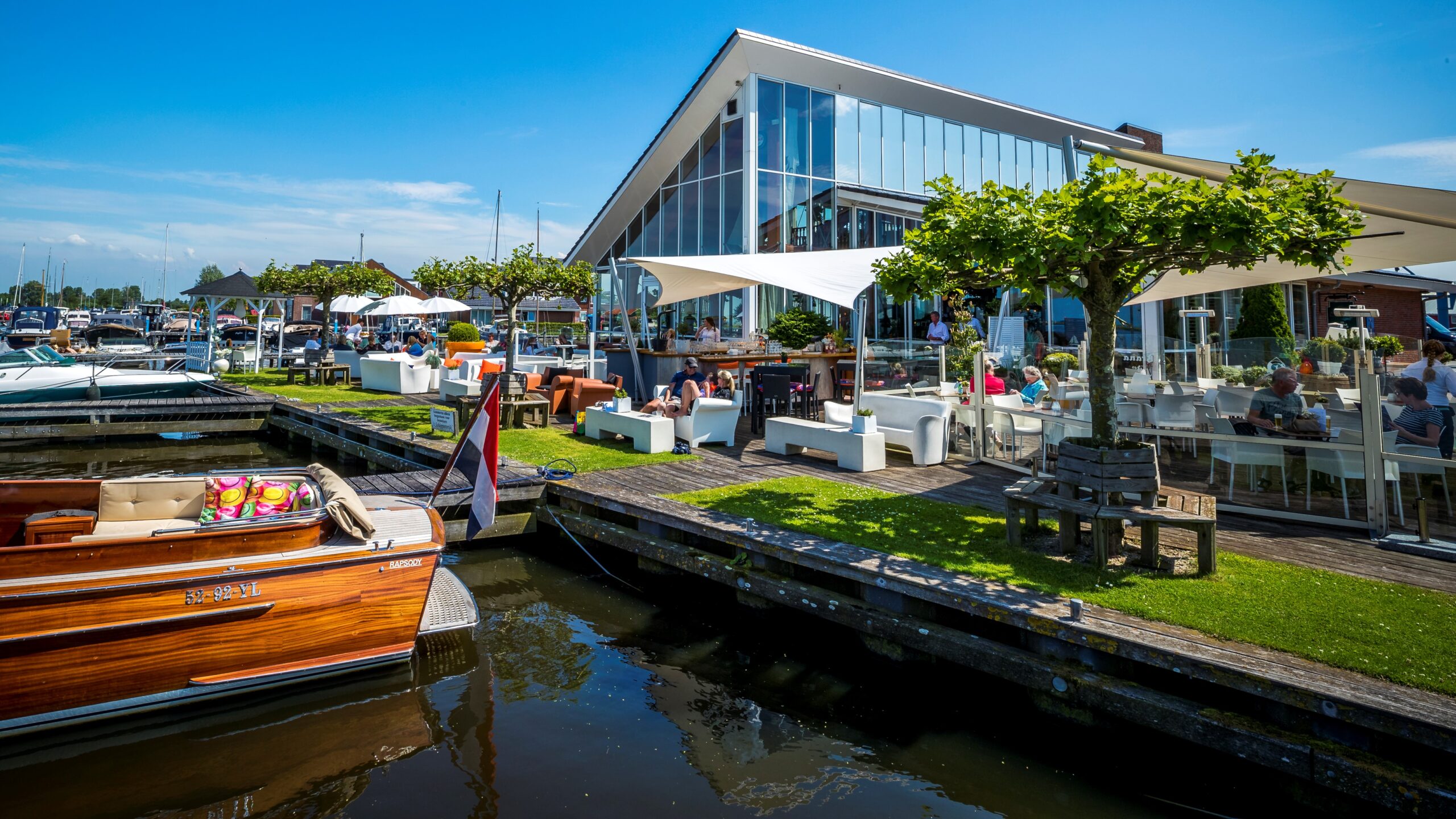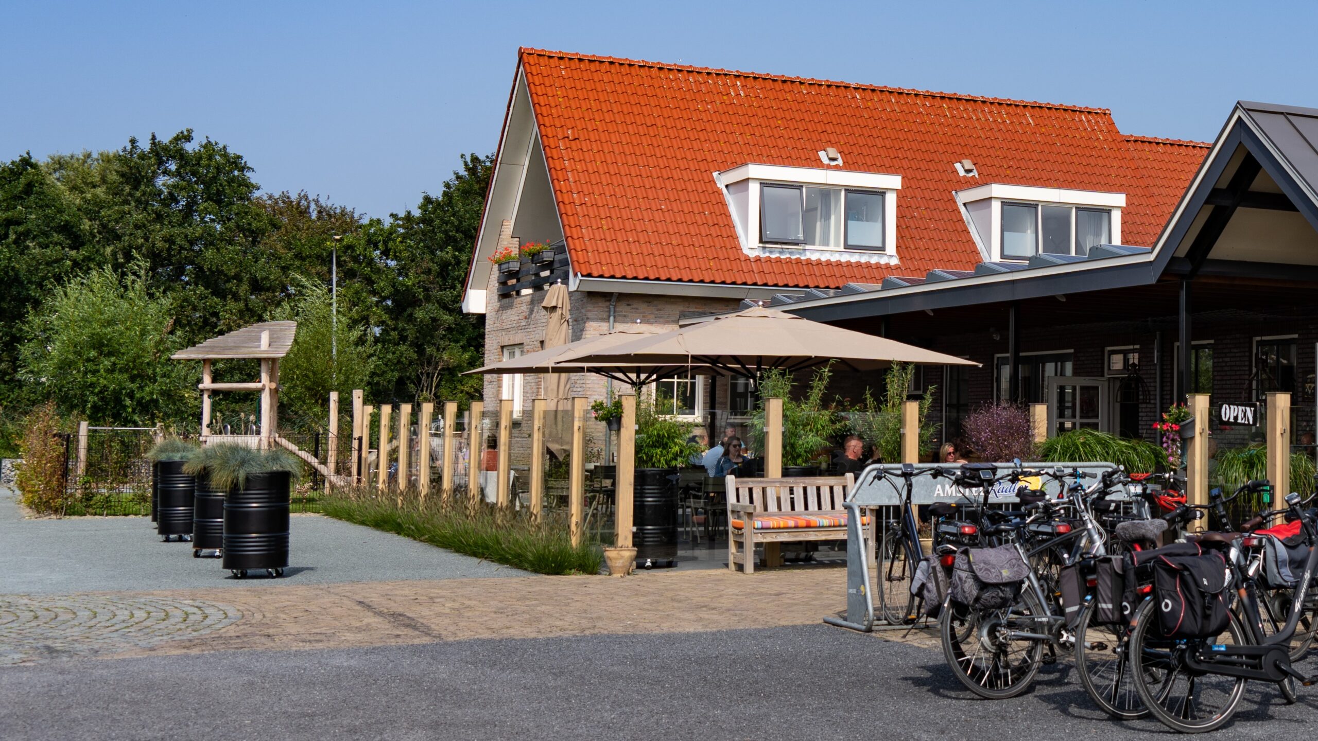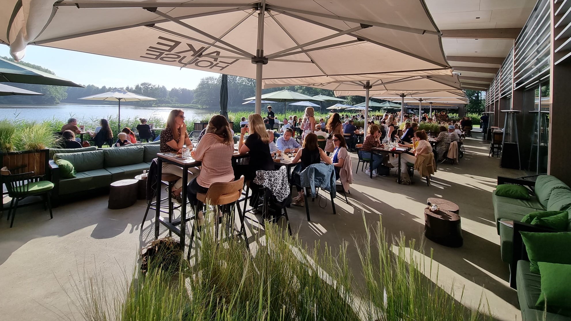 Fraai, laag pand met veel glas en hout, uitkijkend over de waterpartijen van het Lage Bergse Bos. En voor dat pand ligt een minstens zo mooi terras, met grote, deels ronde loungebanken en verschillende zitjes.