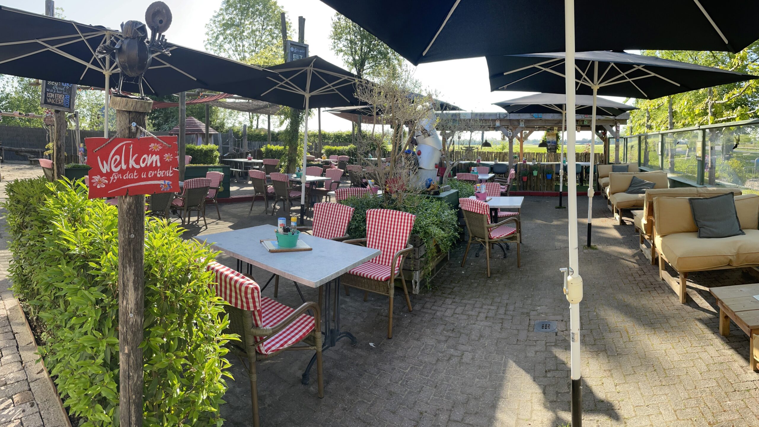 Mooi, ruim opgezet terras dat deels wordt overspannen door een stretchtent. Boven het andere deel kan vanuit het midden een zonnescherm worden uitgedraaid. Kortgesnoeide bomen met fris groen blad en priklampen geven het terras een gemoedelijke uitstraling, geholpen door het prima meubilair en de bloeiende planten op de grotere tafels.