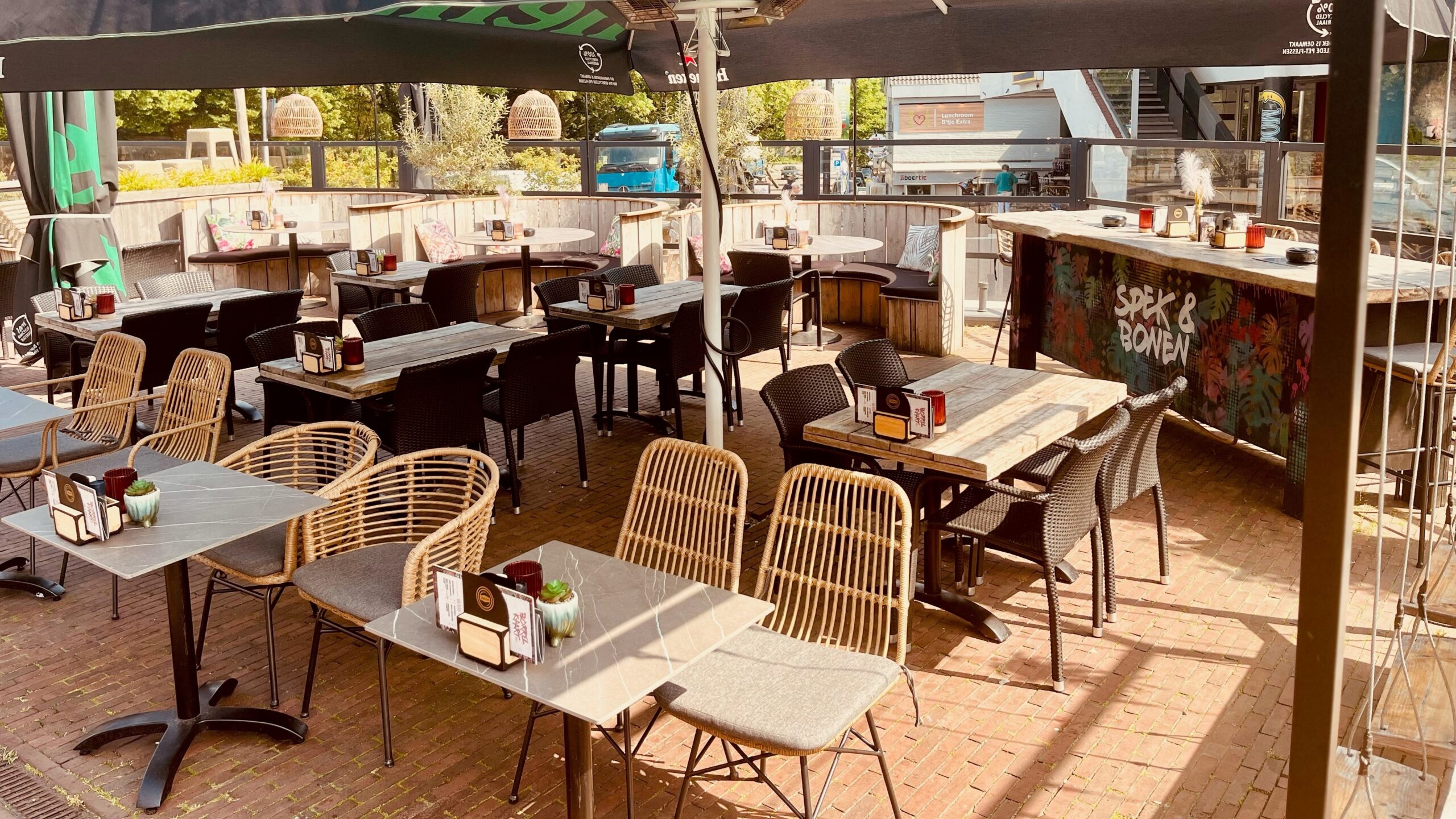 Met een serre tegen de pui en een terras aan de overkant van de straat, kunnen gasten het hele jaar van de zon genieten bij Spek & Bonen in Sliedrecht.