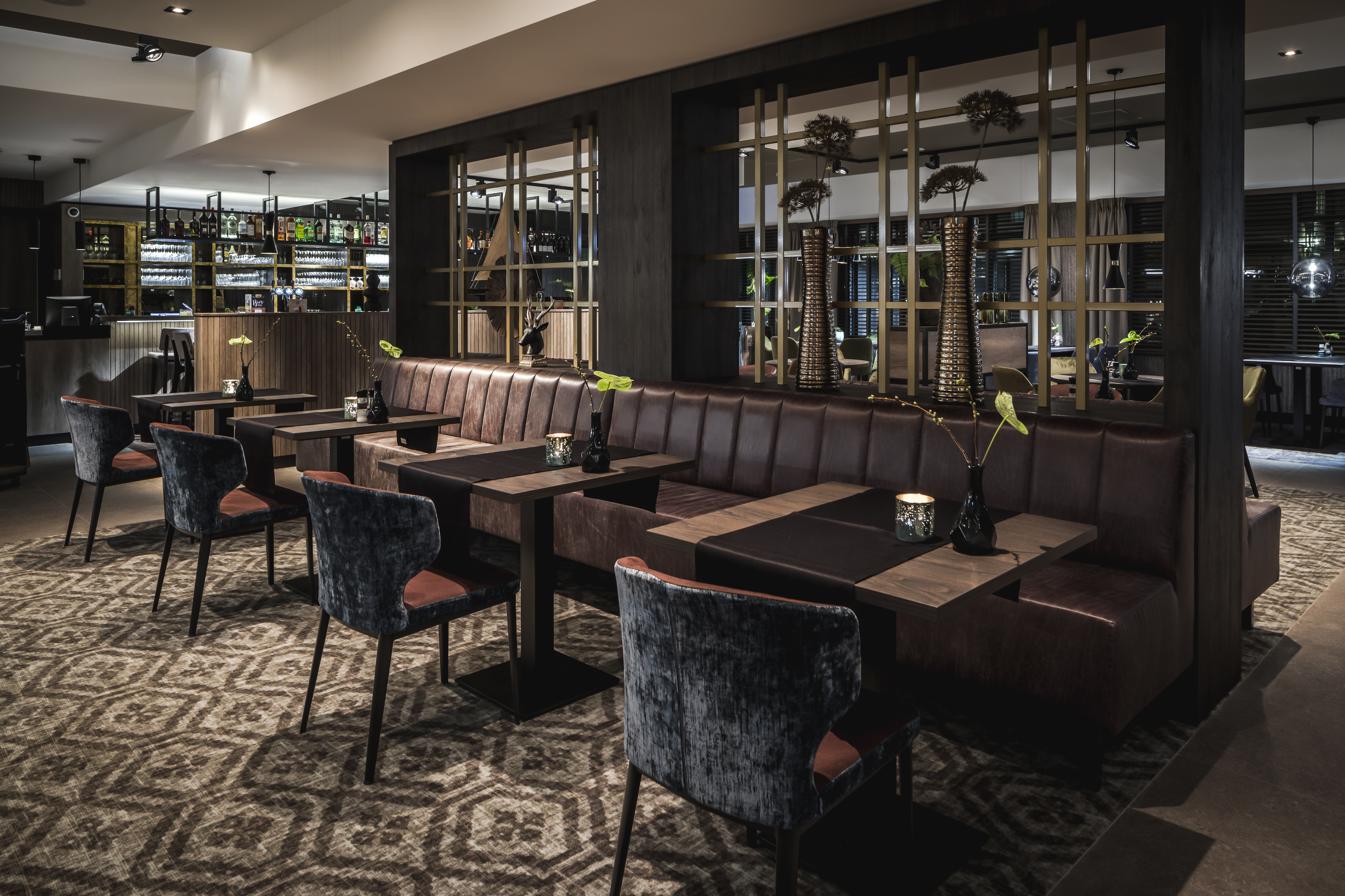 Foto's van het nieuwe horecainterieur van hotel Brinkzicht/restaurant-bowling Het Meer in Vledder. Het design is van interieurarchitect Hans Kuijten.