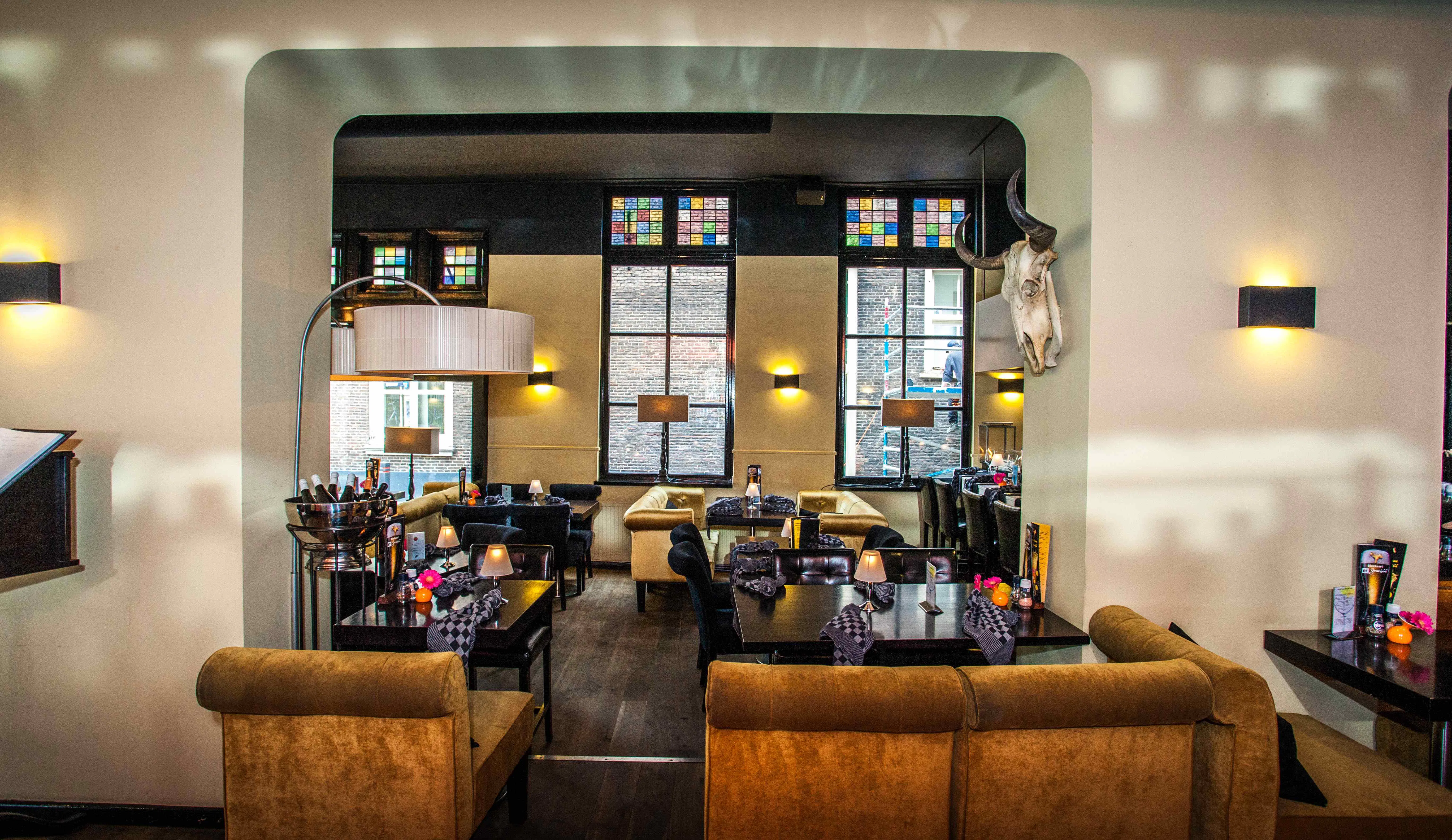 De vilten gordijnen zijn een moderne knipoog naar een klassiek bruin café, inclusief het halfronde gordijnhalletje bij de voordeur van dit fraaie hoekpand.