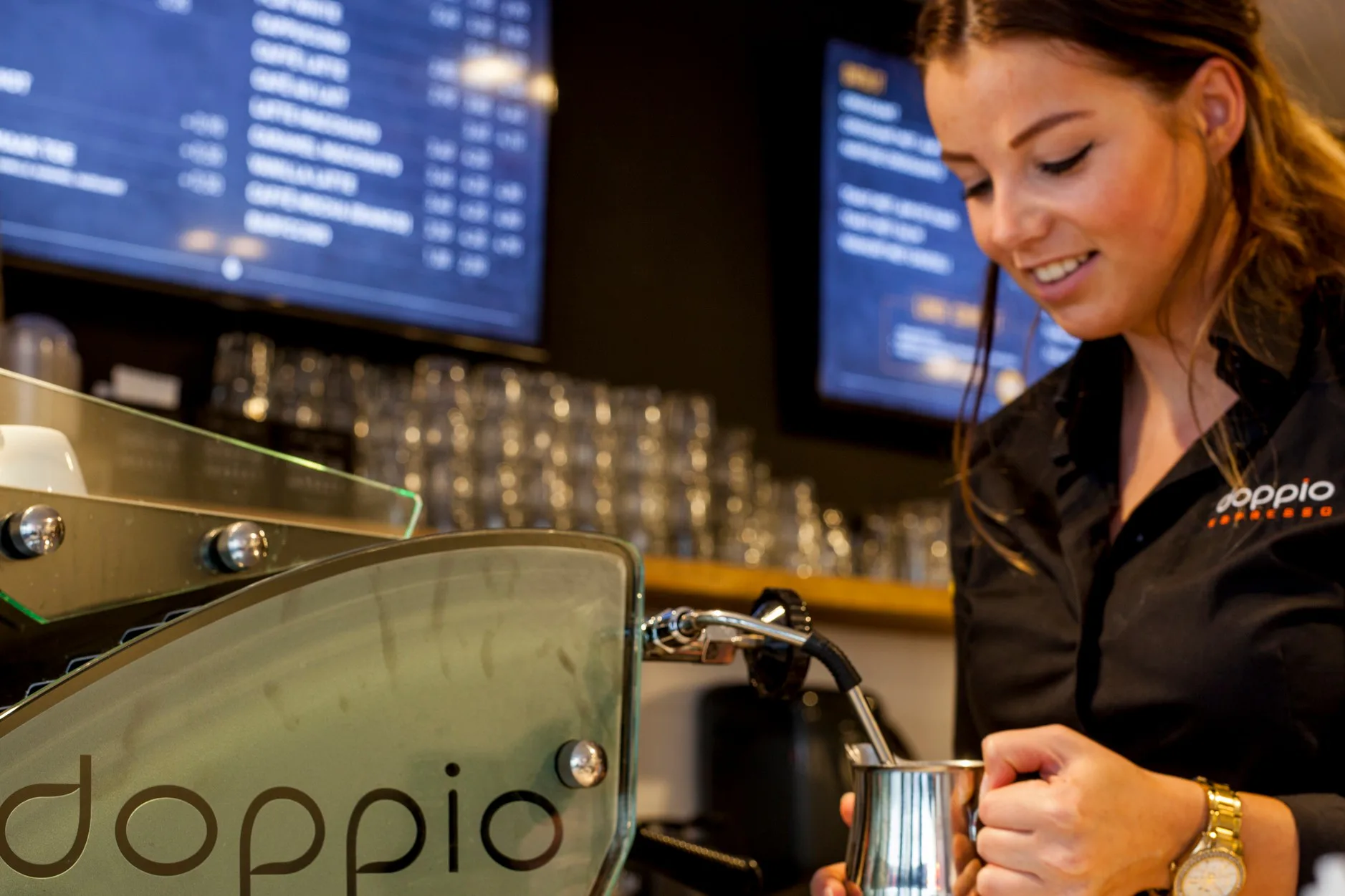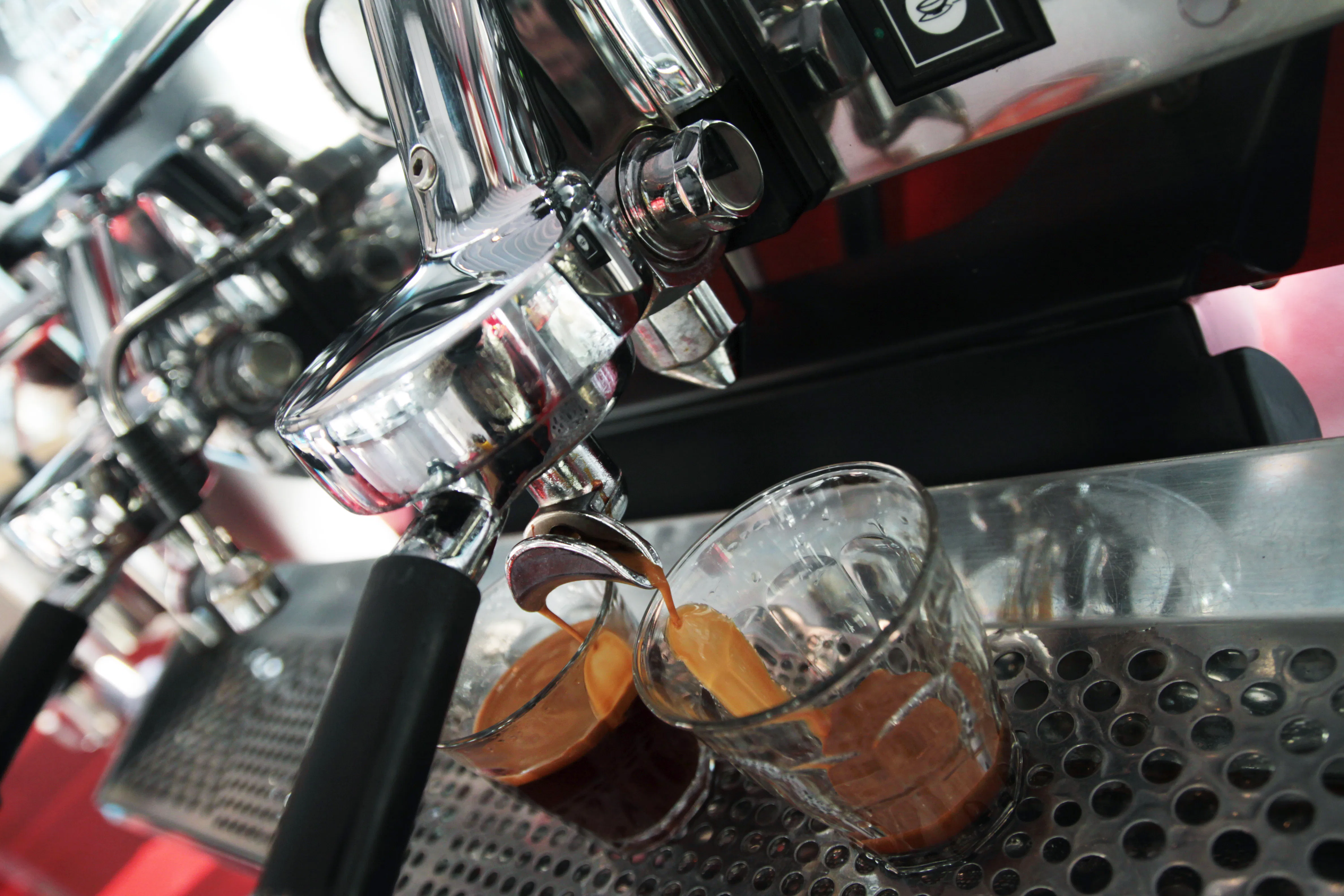 Alles is hier aanwezig om topkoffies te maken: topmachine, goed ingericht werk- station, er ligt zelfs een naked portafilter om doppio's te maken.