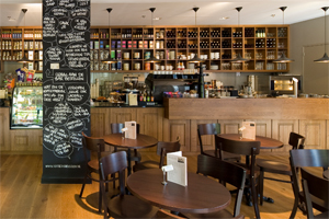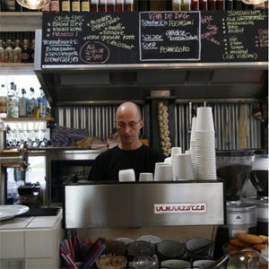 Marco van Oosten draait in zijn eentje deze vestiging van Kaldi. Er is dan ook geen bediening, gasten kunnen aan de counter hun koffie halen.