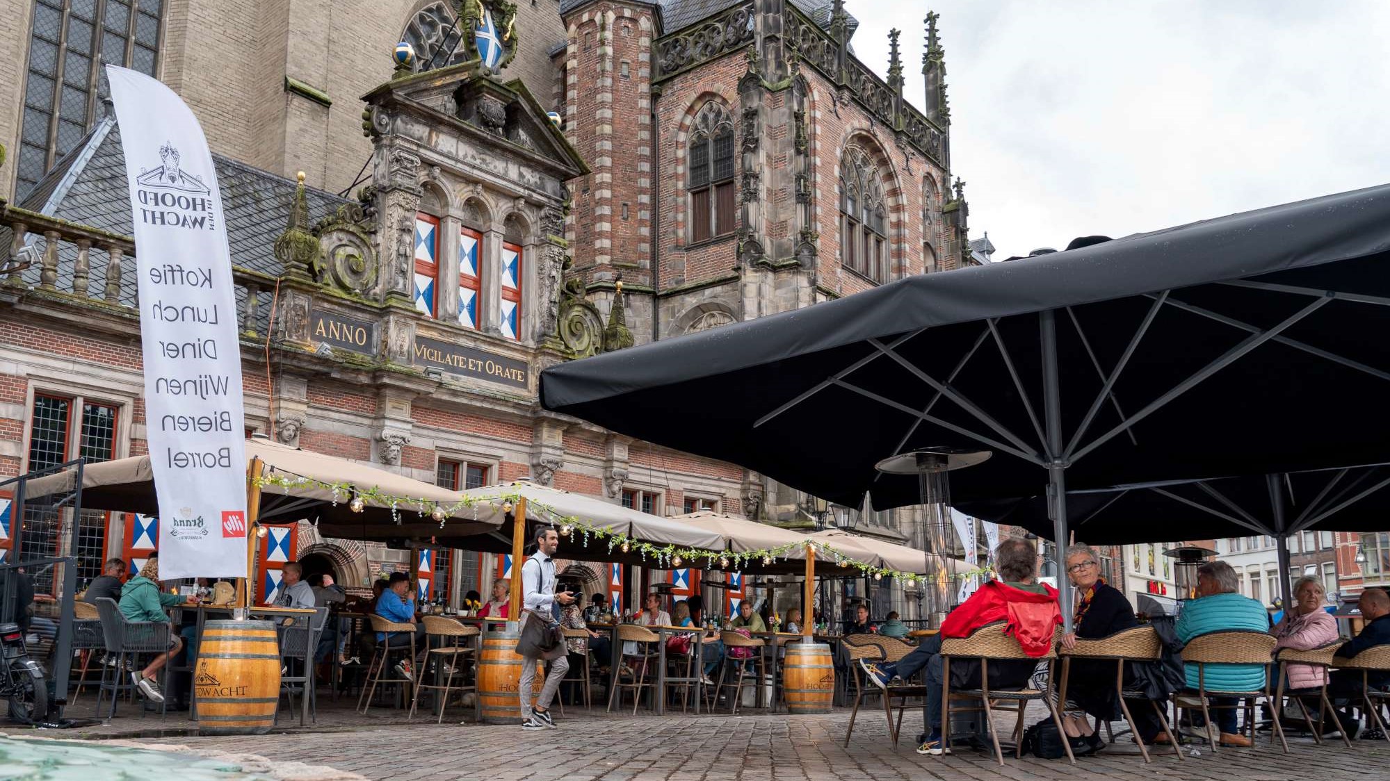 Op de behoorlijk horecadichte Grote Markt in Zwolle heeft In Den Hoofdwacht misschien wel het mooiste terrasplekje: leunend tegen de eeuwenoude muren van de Grote Kerk staat het monumentale pand De Hoofdwacht uit 1614, met zowel een gevelterras als een eilandterras op het plein.