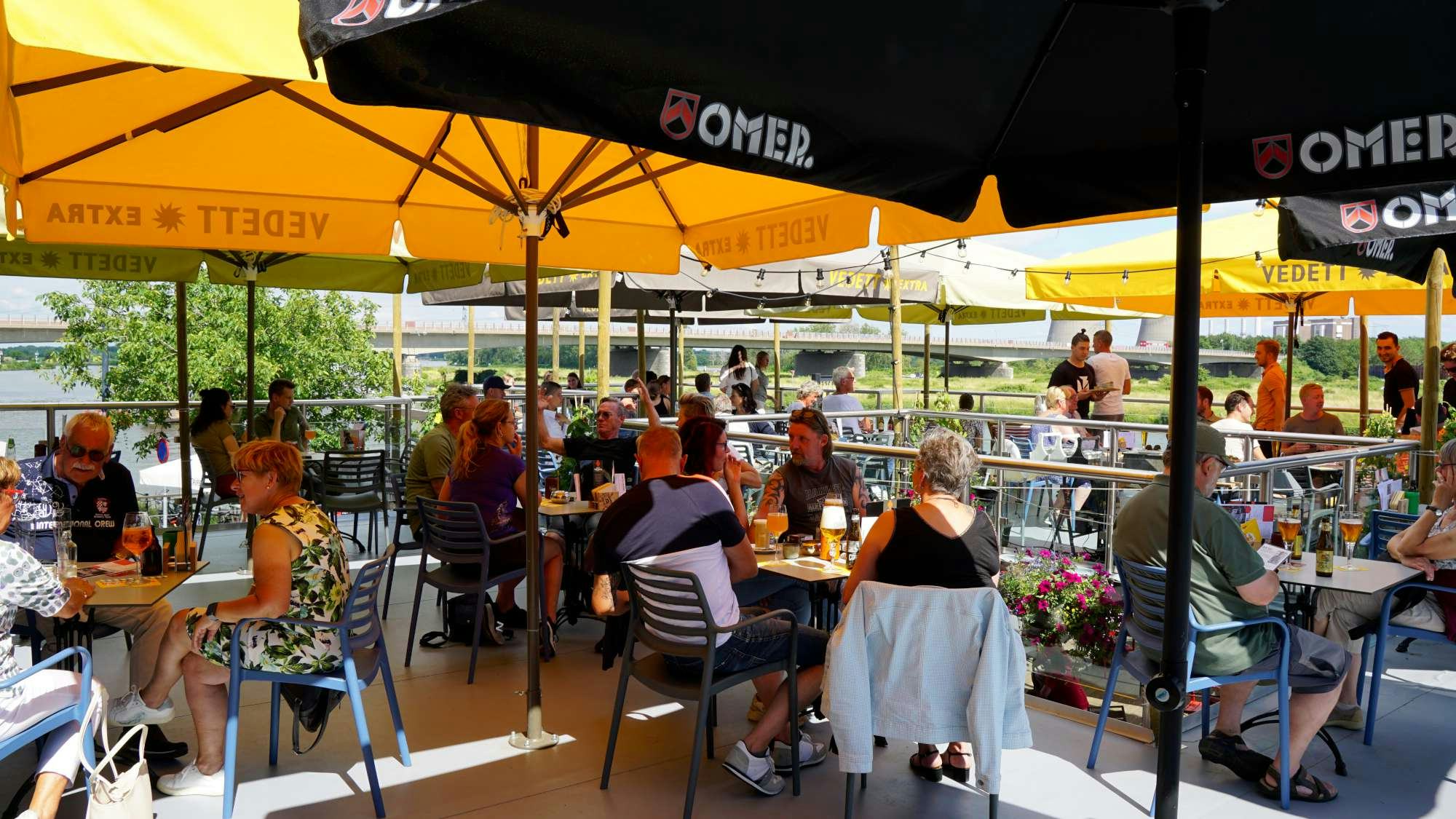 Vorig jaar haalde Café-Maasterras 't Veerhuis het nieuws met een dubbeldeksterras, zodat ondernemer Bram Smeets ondanks de coronabeperkingen toch voldoende gasten een plek kon bieden. Dit jaar is dat gelukkig niet nodig en is het terras aan de Maas weer als vanouds uitsluitend op straatniveau opgebouwd.