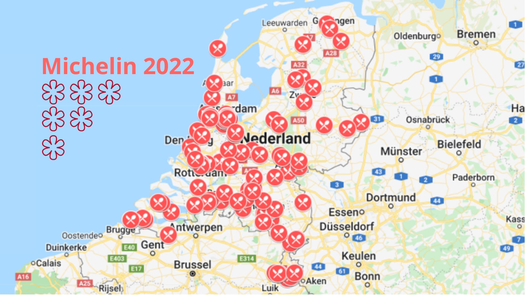 Van gevestigde namen als driesterrenrestaurant De Librije (al 18 jaar) en sterrestaurant De Kromme Dissel (al 51 jaar) tot minder bekende nieuwkomers als Lars Amsterdam en wat de denken van Julemont, wat uit het niets twee sterren krijgt. Dit zijn alle Michelinsterren van 2022 in één oogopslag in kaart.