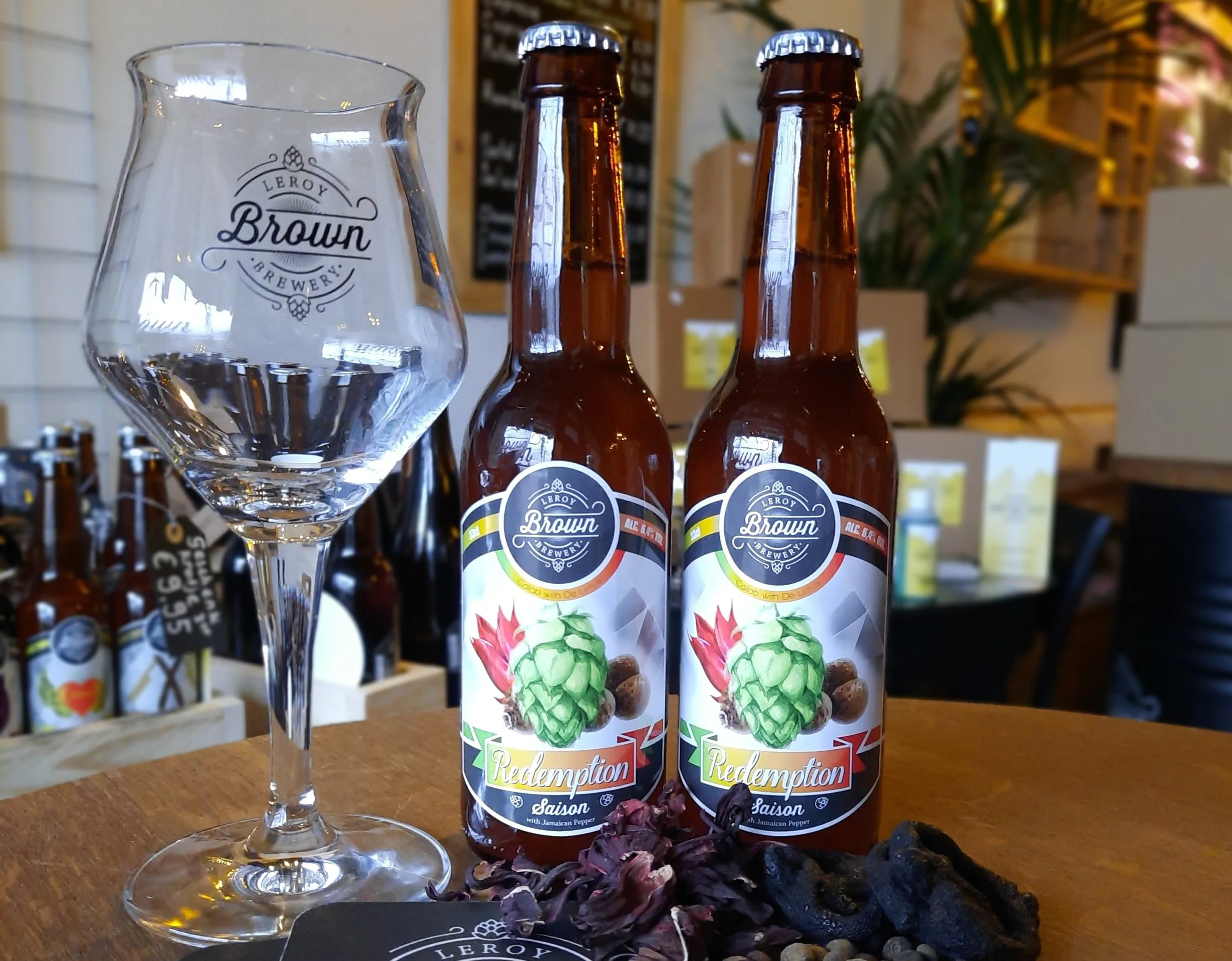Restaurant De Limus in Nijmegen en de Arnhemse bierbrouwer Leroy Brown Brewery hebben samen een bier gebrouwen: Redemption, een saison met onder meer peper, hibiscus en gefermenteerde citroen. 'Maar dit is geen exclusief huisbier. Dit is een collab tussen brouwer en chef.'