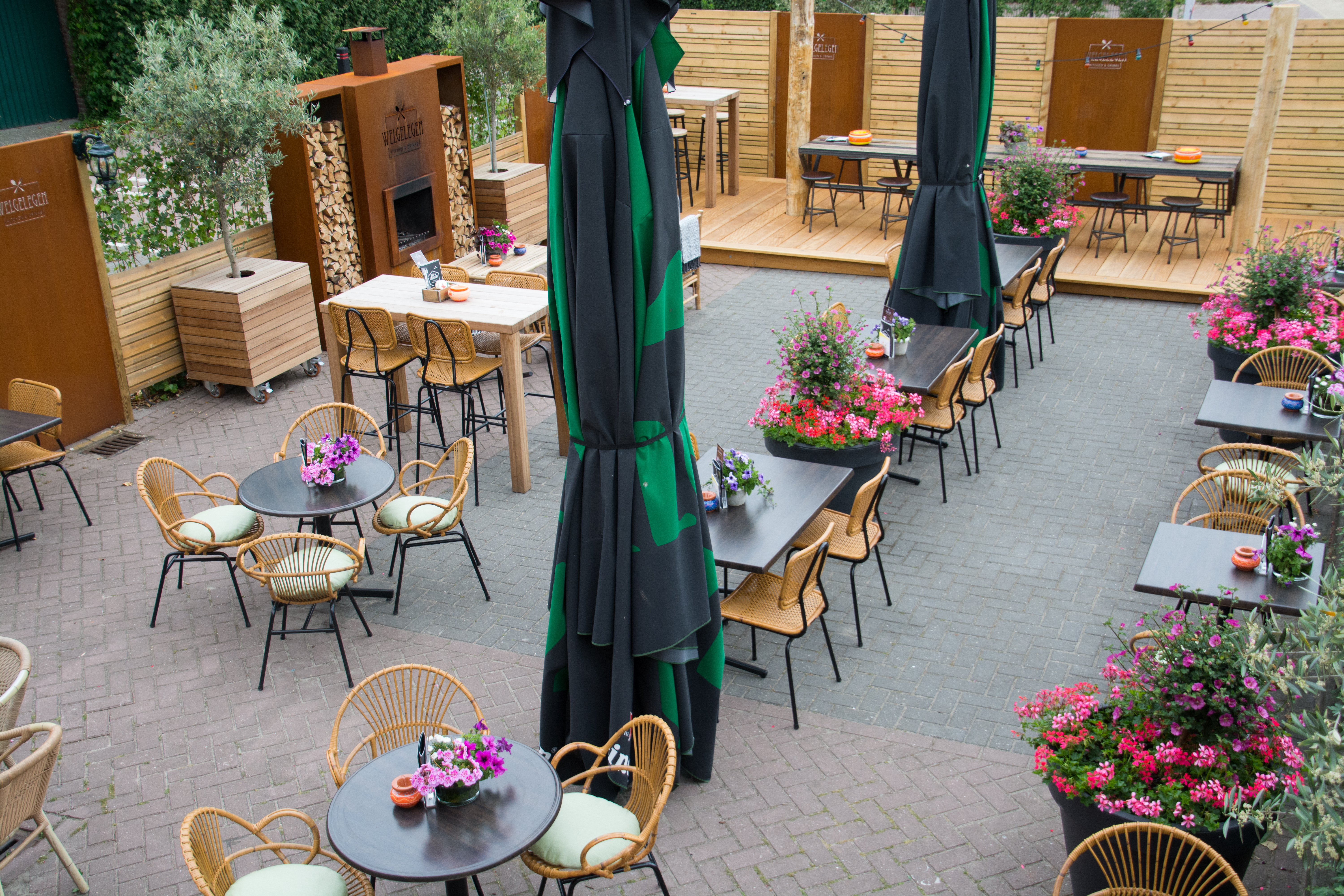 Tot in detail klopt alles op het terras van Welgelegen, zoals de fietsenrekken met het frisse, rode logo dat ook op borden aan de gevel hangt. Volgens de laatste trend is het terras ingericht met stoelen, banken en zelfs een buitenhaard. Leuke kussentjes op de stoelen en een aparte lange 'stamtafel' buiten.